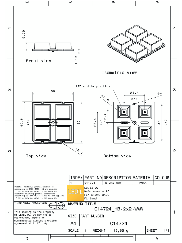 Ledils C14724_HB-2X2-WWW Lentilles et assemblages LED carrés en PMMA 50x50mm(D)10mm(H) pour éclairage LED