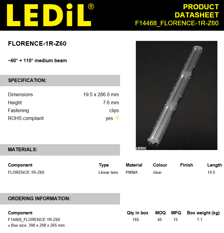 Ledils F14468_FLORENCE-1R-Z60 Assemblages de lentilles LED en PMMA, bande rectangulaire transparente moyenne, éclairage LED à clipser