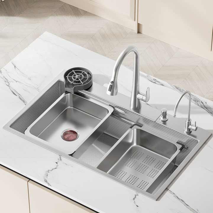 Évier de cuisine à cuve unique en acier inoxydable 304, avec trou de vidange gauche, couleur naturelle, épaissi, pour usage domestique