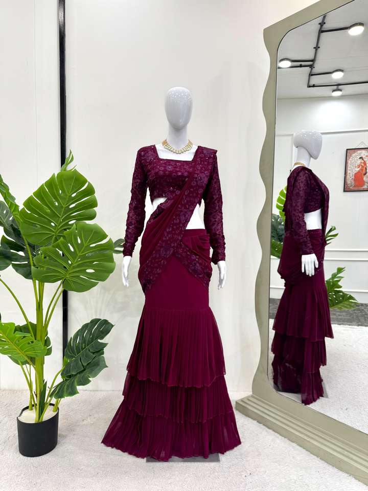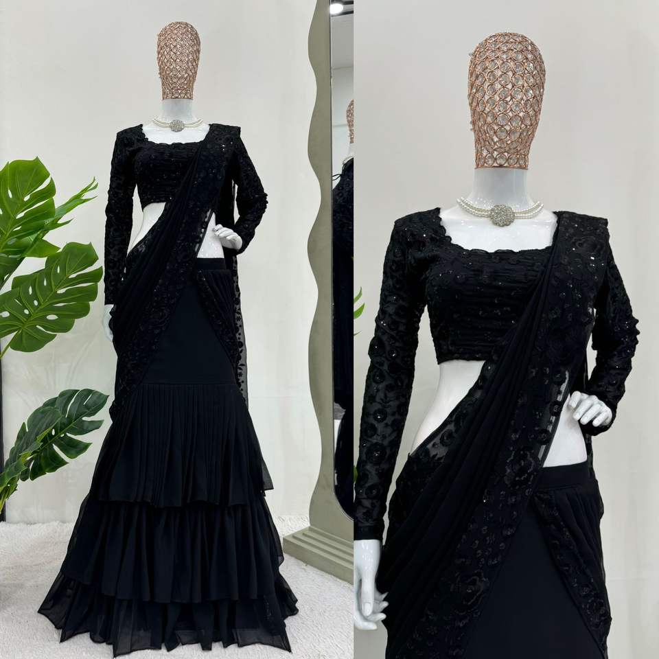 Lehenga Type Prêt à Porter Volants Style Femmes Saree Premium Georgette Tissu Party Wear Saree aux prix de gros