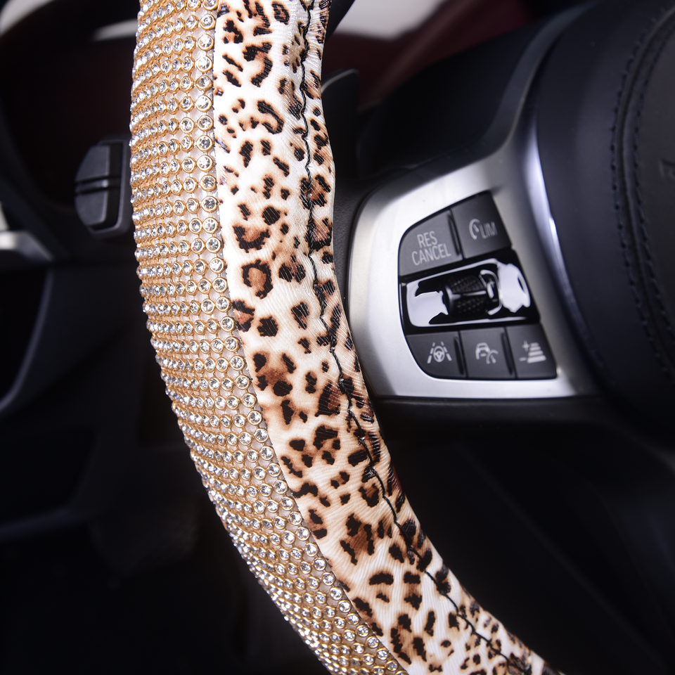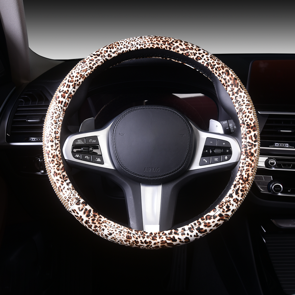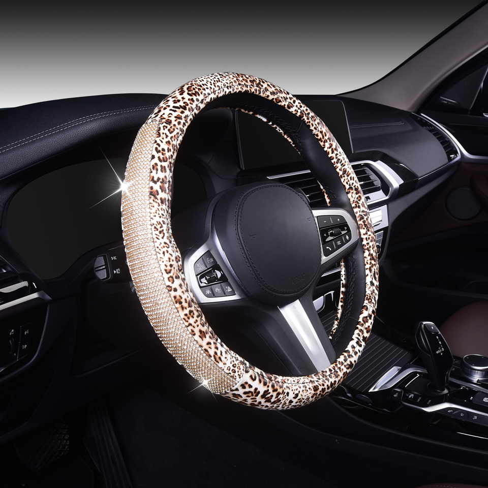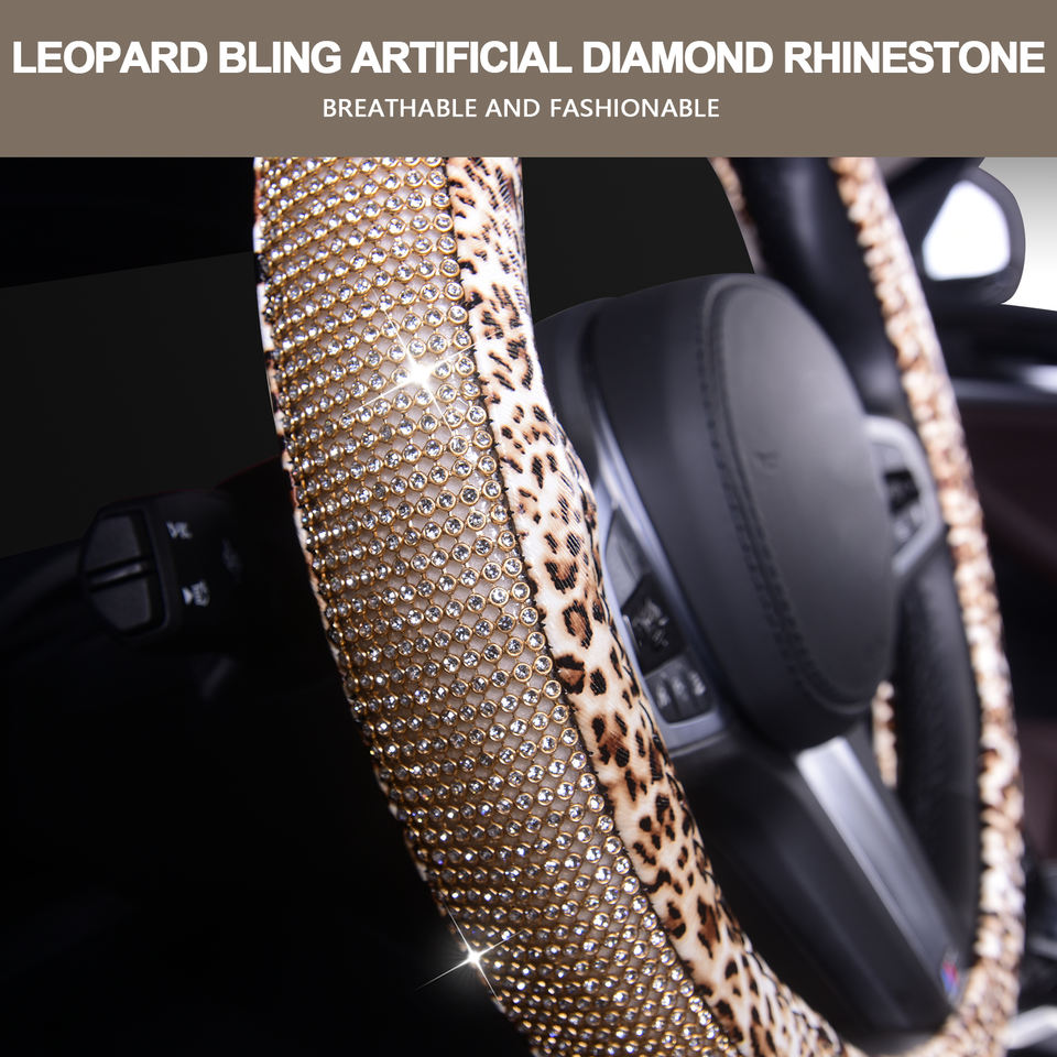 Housse de volant en cuir léopard pour femmes filles avec strass en cristal Bling Bling anti-dérapant universel 15 pouces
