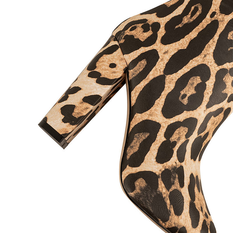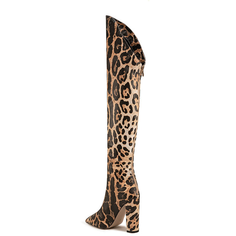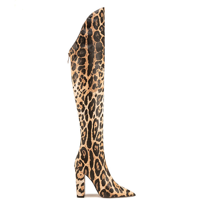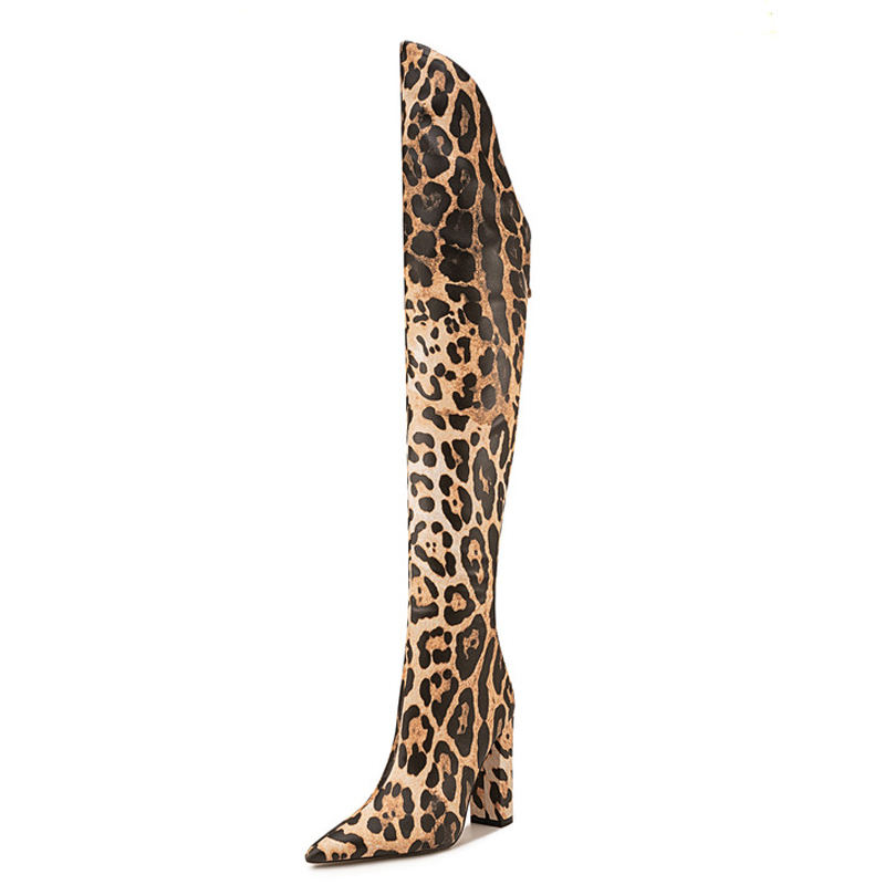 Bottes hautes pour femme à imprimé léopard avec fermeture éclair arrière, talon épais, bout pointu, coupe en V, grande taille 47