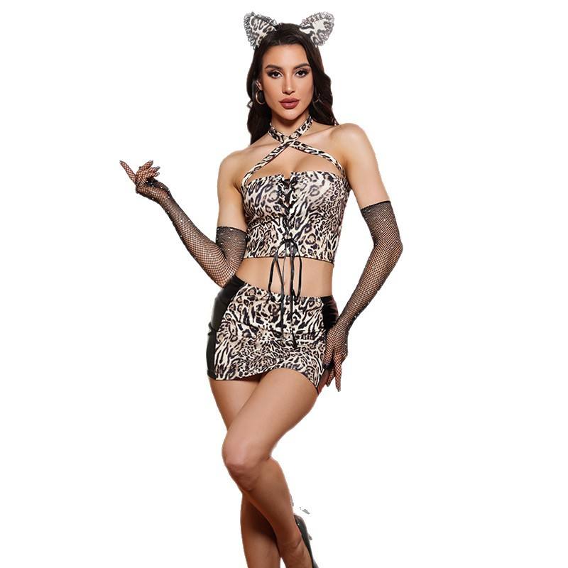Léopard imprimé Catwoman Cosplay ensemble pour femmes Sexy entrecroisé licou dos nu haut queue Flare pantalon avec oreilles Halloween Costume
