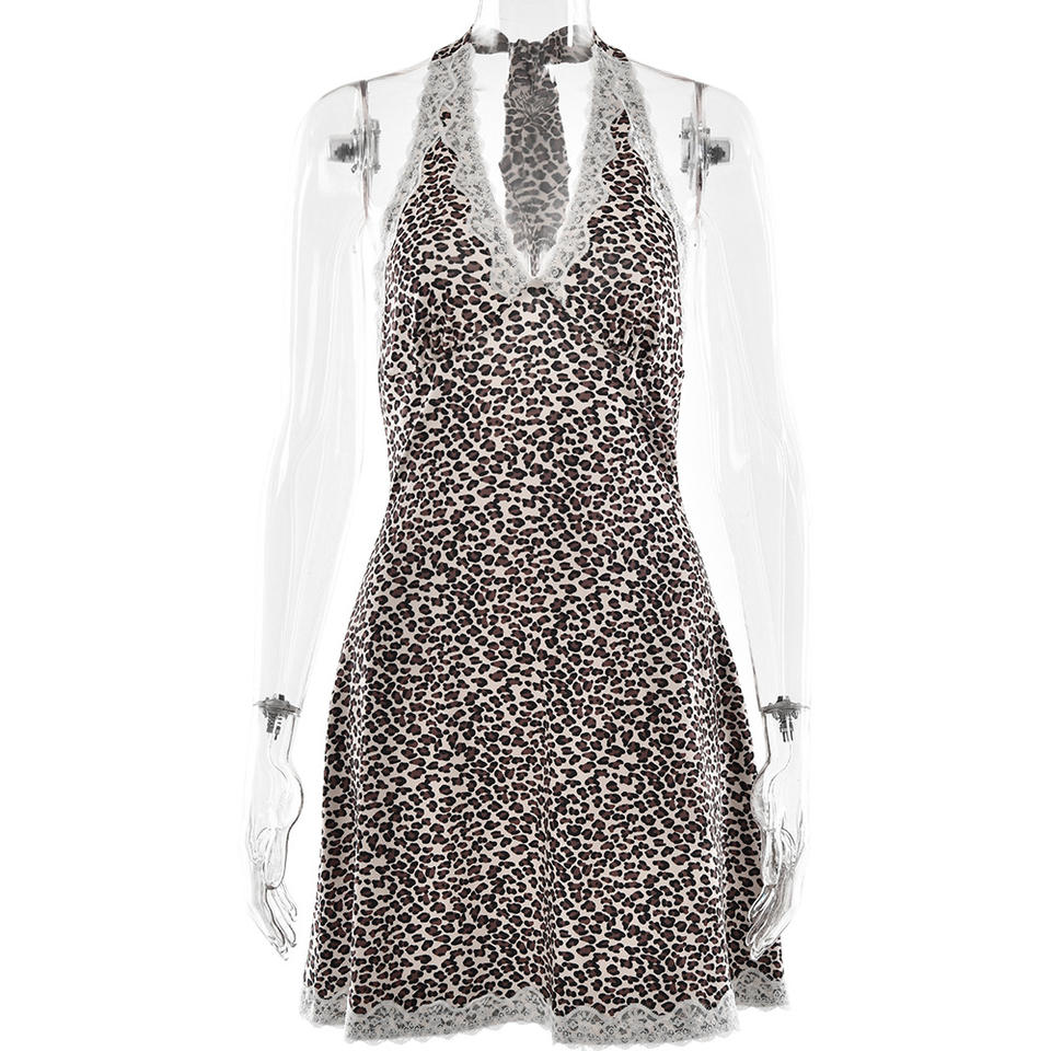 Robe Courte Imprimé Léopard Col Halter Dos Nu Bordure Dentelle Taille Naturelle Respirante Robe de Cocktail Style Rendez-vous