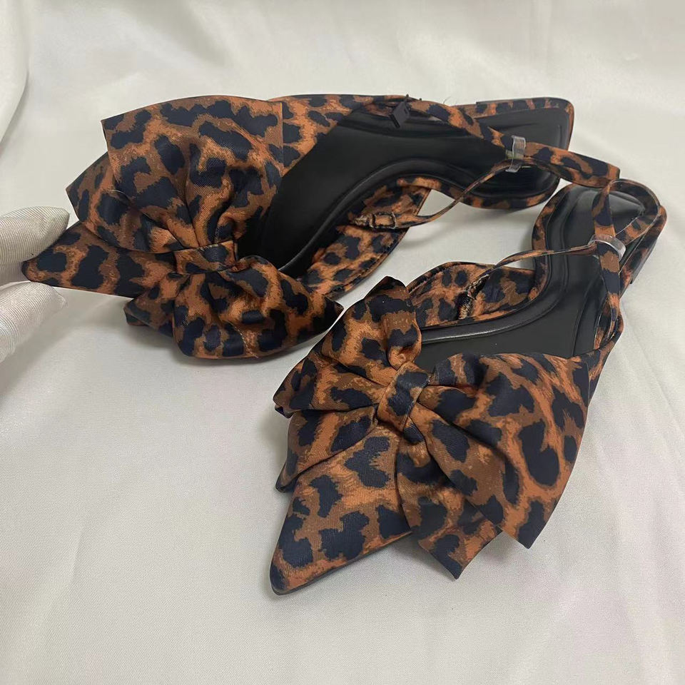 Nouvelles sandales léopard pour femmes, mules plates à bout pointu, sandales d'été pour femmes, sandales à nœud papillon, chaussures slingbacks pour femmes