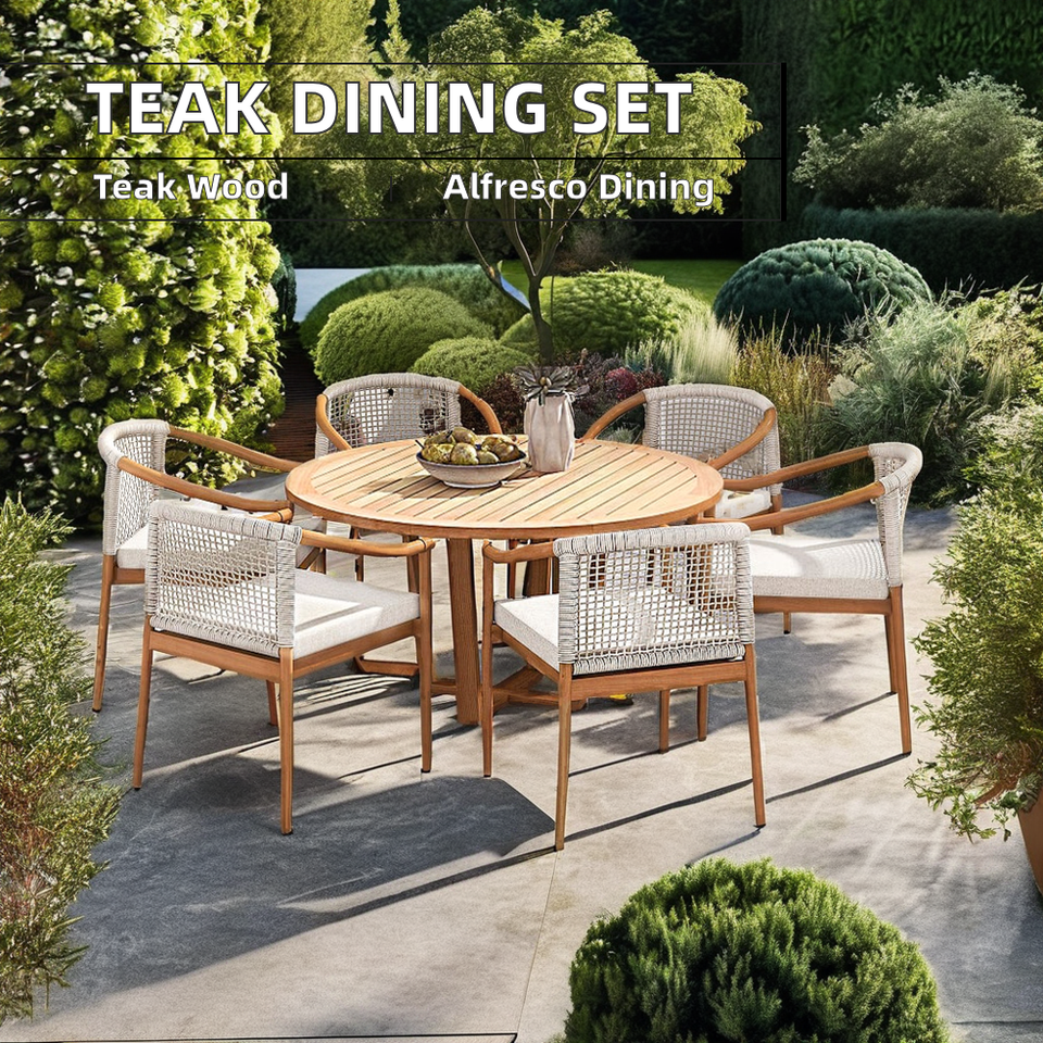 Lestiya Ensemble de salle à manger en plein air Style moderne Teck Bois Corde Meubles Jardin Restaurant Hôtels Parcs Salles Appartements Villas Aluminium