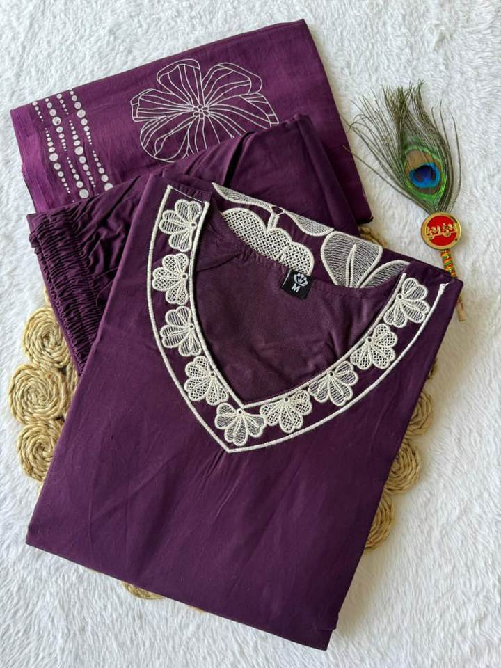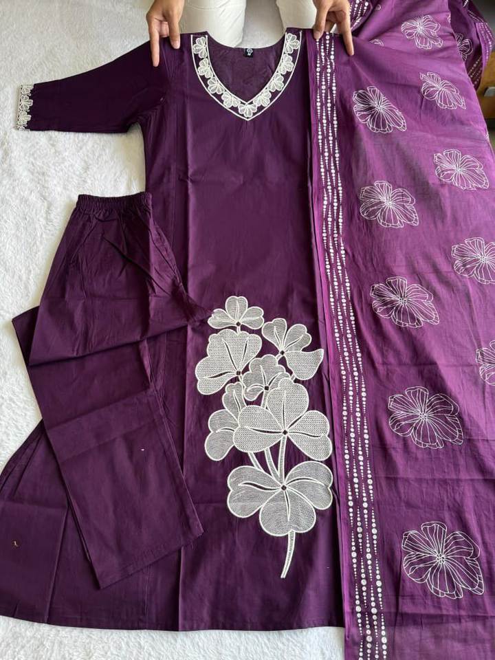 Achetez notre ensemble exclusif de Kurti, pantalon et dupatta en pur coton de haute qualité, coupe droite, bordure fantaisie, idéal pour les prochaines fêtes.
