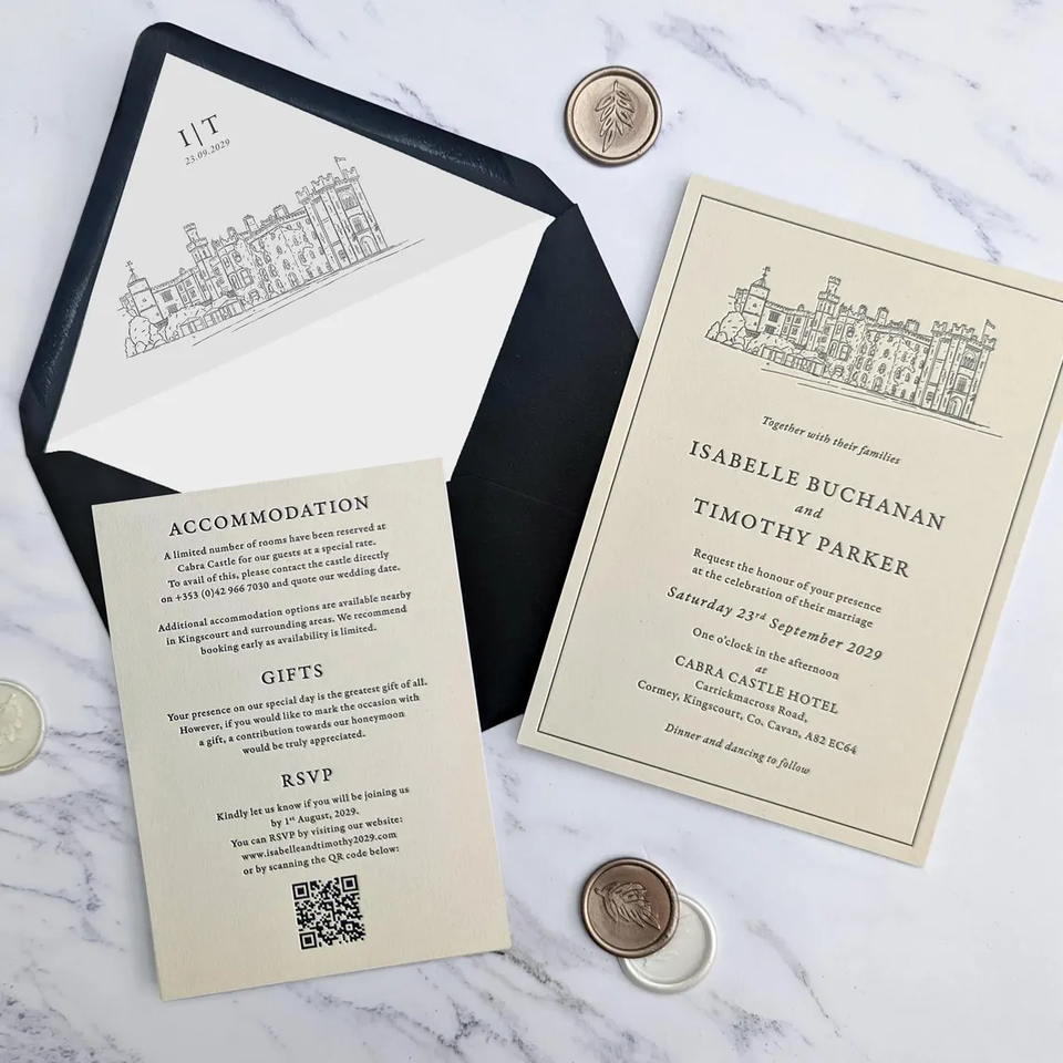Invitations de mariage en typographie traditionnelle, avec motif de l'endroit du mariage personnalisé, papeterie de mariage de luxe