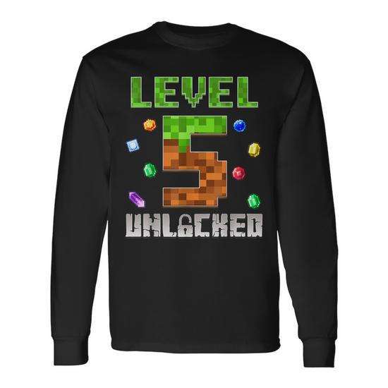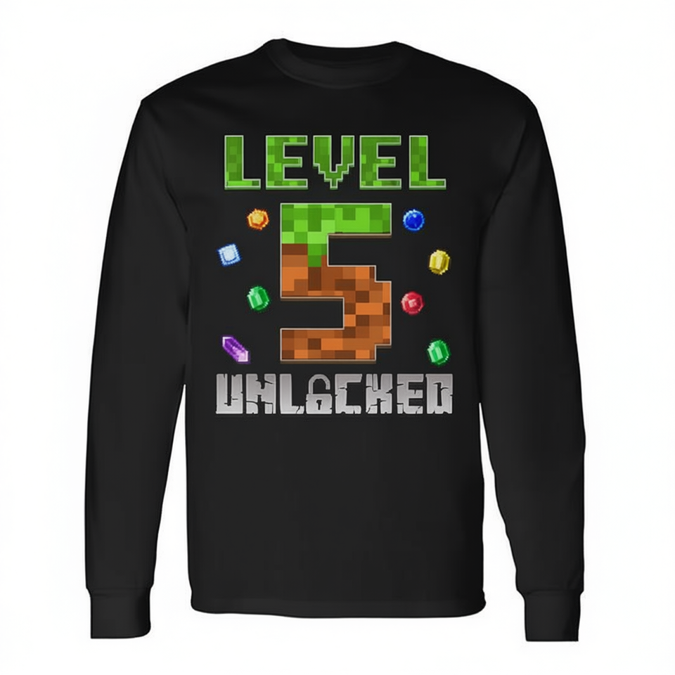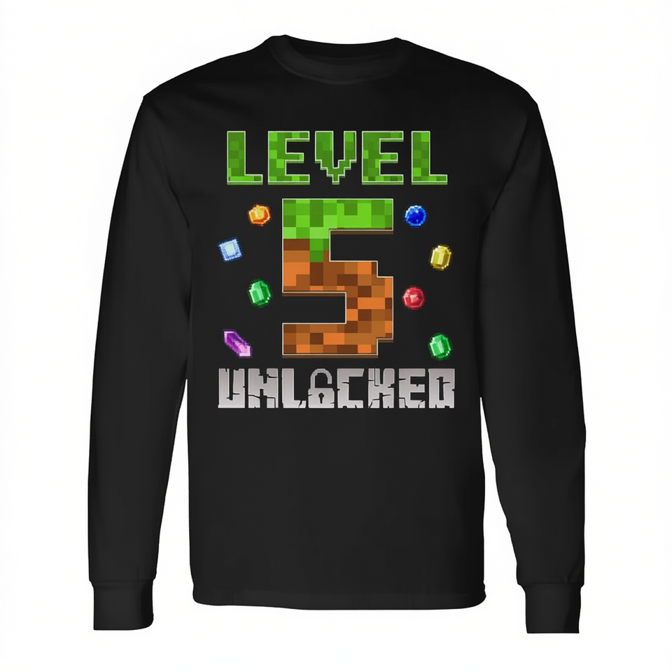 T-shirt à manches longues pour enfants, col rond, impression numérique, cadeau d'anniversaire, niveau 5 débloqué, Pixel