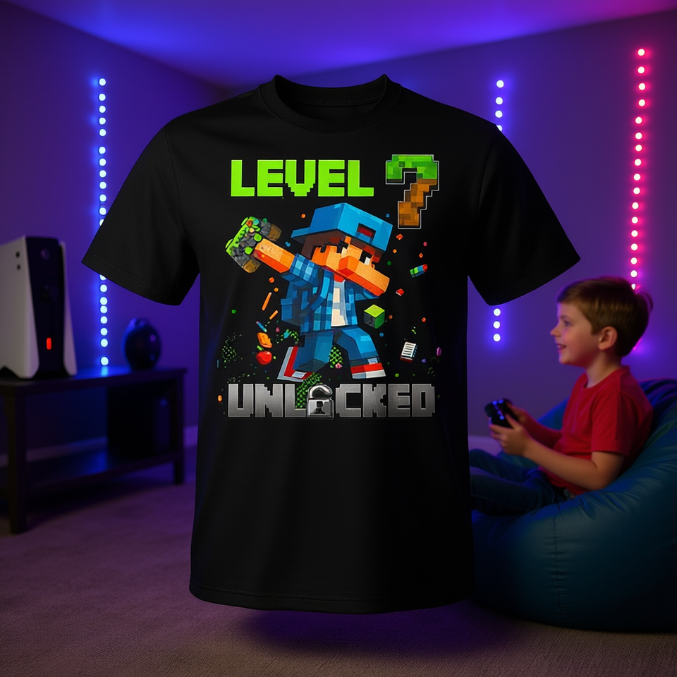 T-shirt d'anniversaire Level 7 Unlocked Pixel Gamer pour enfants, taille 7 ans