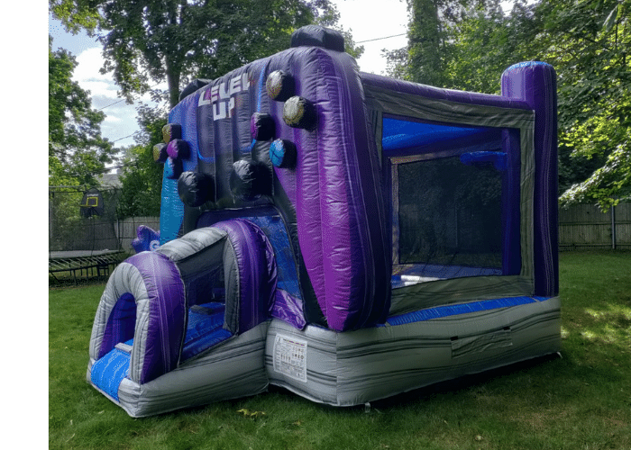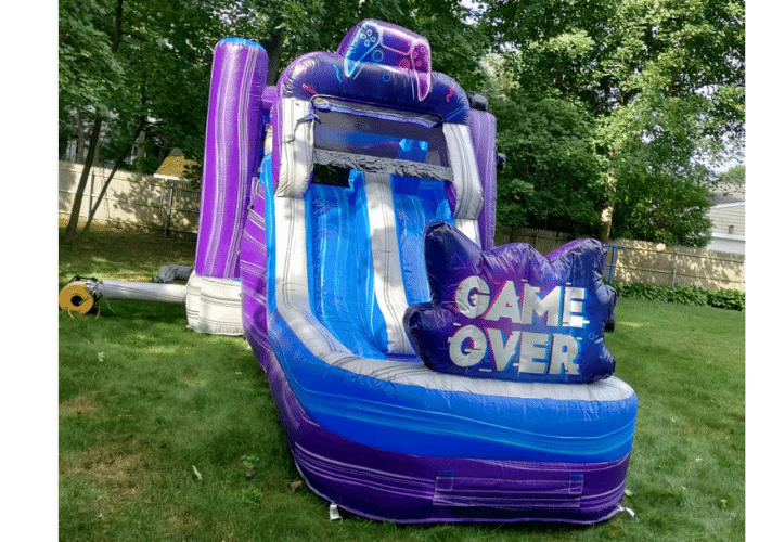 Château gonflable combiné à thème de jeu vidéo avec toboggan aquatique, piscine, manette de jeu, château gonflable, trampoline, moonwalk