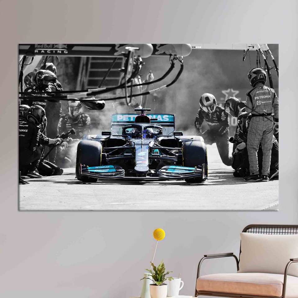 Impression sur toile de voiture de Formule 1 Lewis Hamilton : décoration murale moderne, encadrée