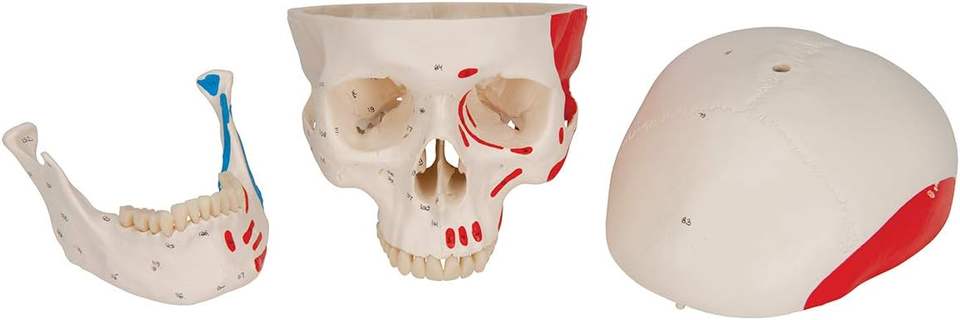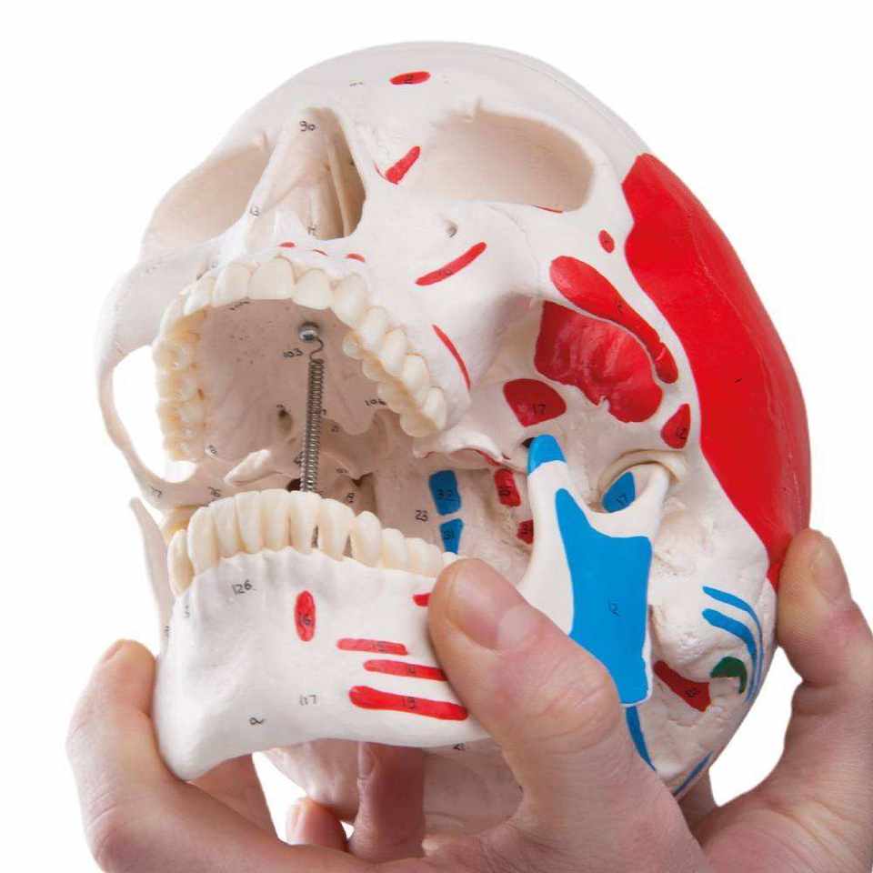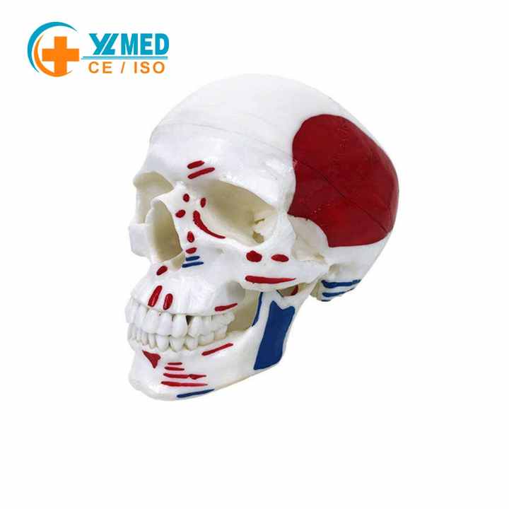 Modèle de crâne adulte grandeur nature avec muscles peints, mâchoire mobile, sutures claires, outil pédagogique d'anatomie médicale pour la formation scolaire
