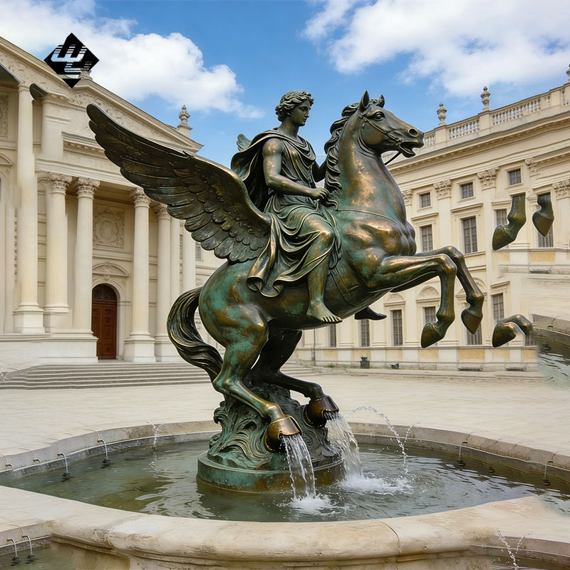 Fontaine d'ange en bronze grandeur nature montant un Pégase, grande sculpture paysagère d'extérieur