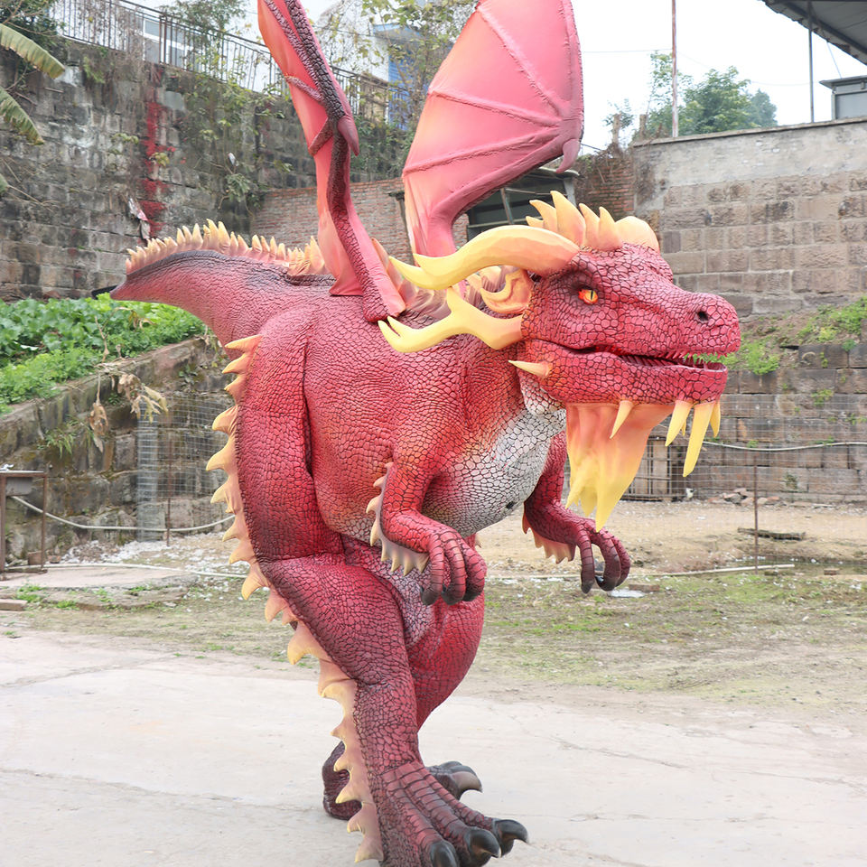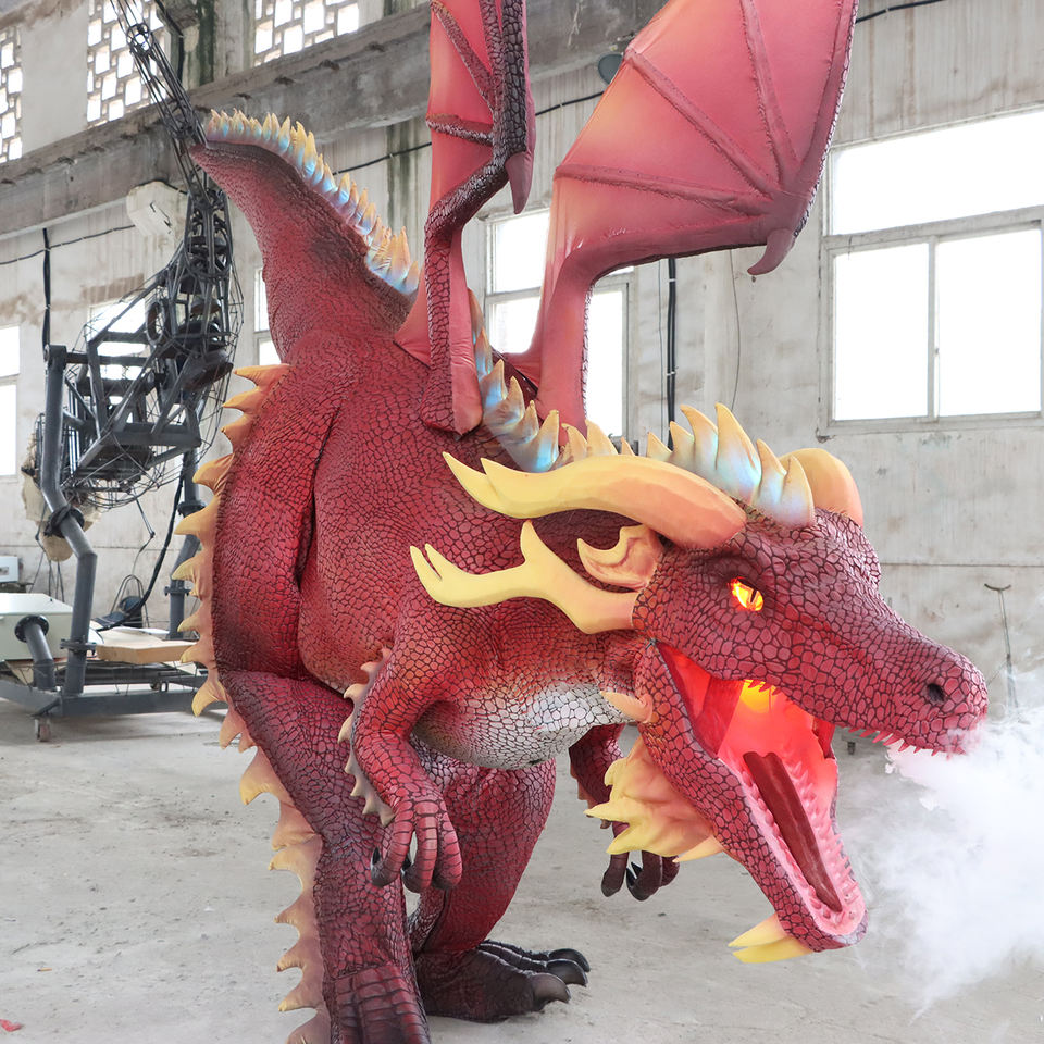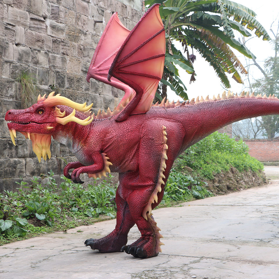 Life Size Realistic Walking Silicone Robotic Red Dragon Dinosaurs Costumes With Smoke LED Lights