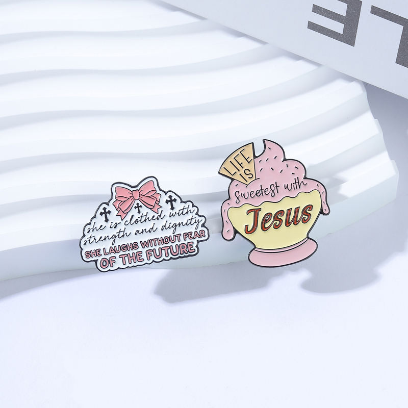 Broche émaillée « La vie est plus douce avec Jésus » – Foi chrétienne, Nœud papillon, Croix, Elle rit sans crainte du futur – Bijou