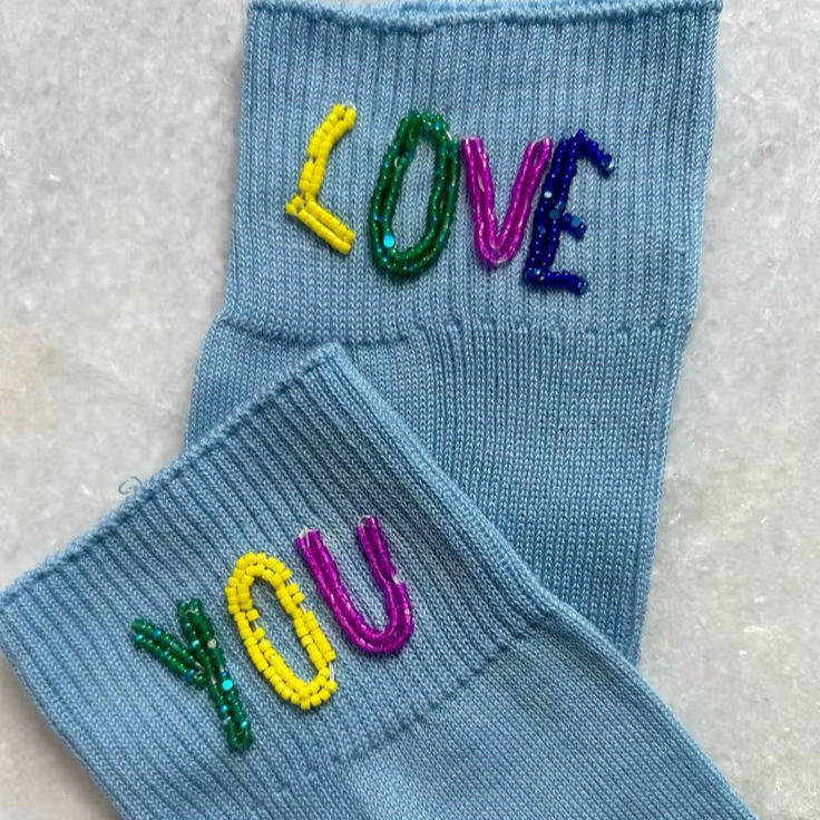 Chaussettes en coton côtelé bleu clair, ornées de perles multicolores et d'un inscription « Love You », accessoires de chaussures décontractées faits à la main, articles de bonneterie