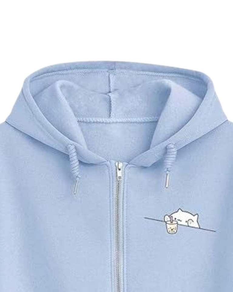 Light Blue Cute Cat Embroidery Zip Up Hoodie Womens Oversized Fleece Hooded Sweatshirt Casual Streetwear