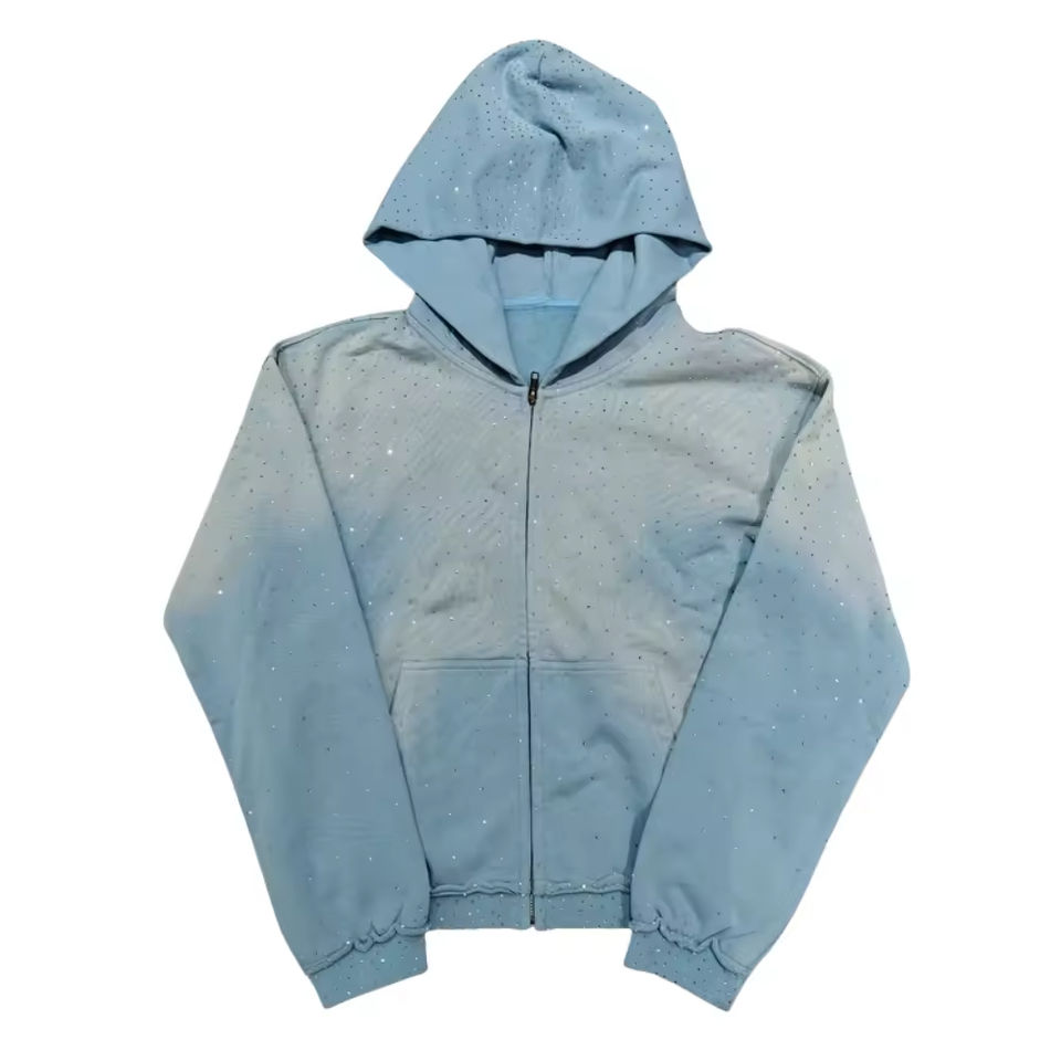 Sweat-shirt à capuche unisexe bleu clair avec strass en cristal, fermeture éclair, style streetwear de luxe, effet délavé soleil, 100% coton