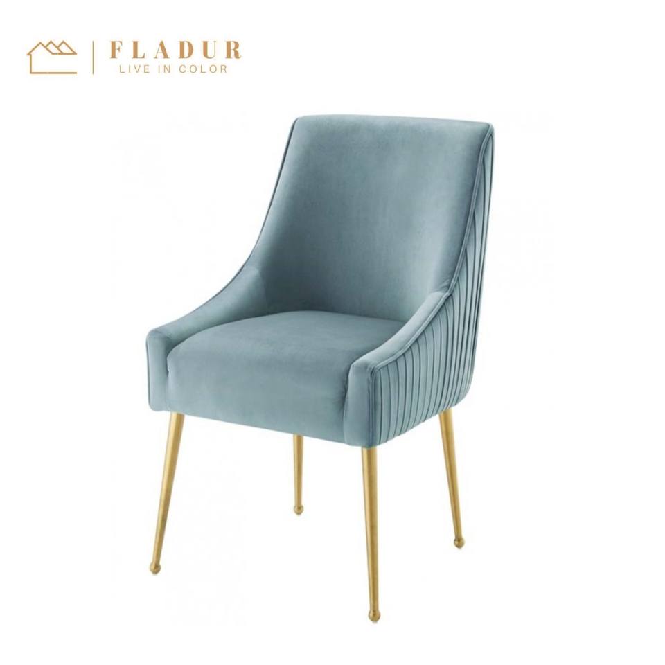 Chaise acrylique de salle à manger en velours, bleu clair, dossier plissé avec jambes en acier inoxydable, métal, fauteuil de salon