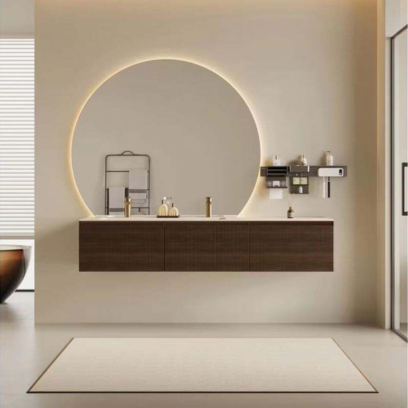 Meuble-lavabo mural simple de style crème français minimaliste avec miroir rond intelligent