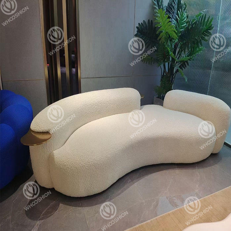Canapé Courbé Designer Style Netflix Français en Tissu Velours Mouton Cashew Crème, Meuble de Salon Design Façon Canapé Petit Pois
