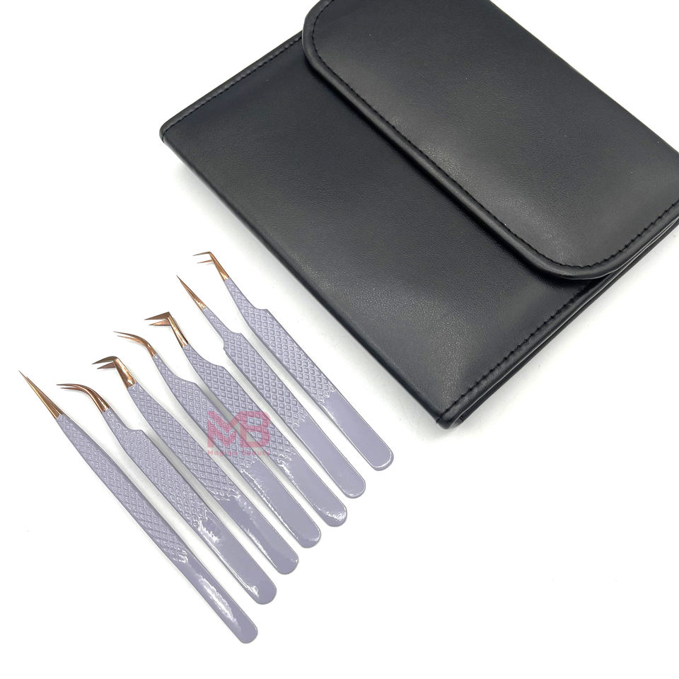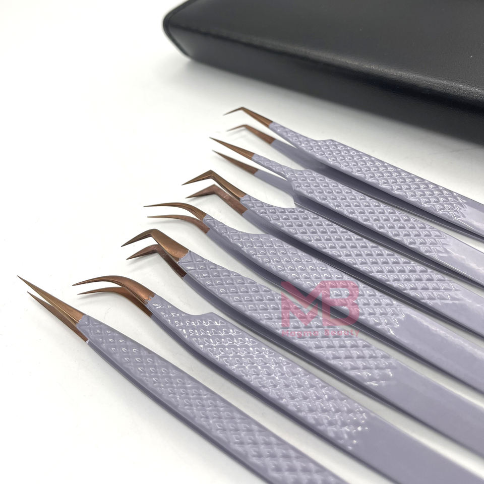 Light Grey Colour Handle Coated Professional Eyelash Extension Tweezers Japanese Stainless Steel Rose Gold Tip Custom Brand Name