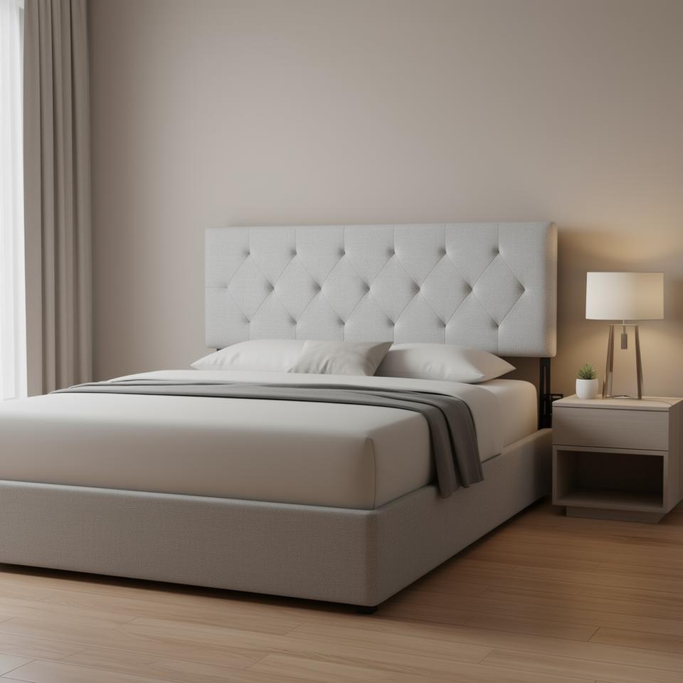 Lit double gris clair capitonné en losanges avec tête de lit réglable en hauteur (L 56,3 x H 35,6-47,4 pouces) – Meuble de chambre à coucher