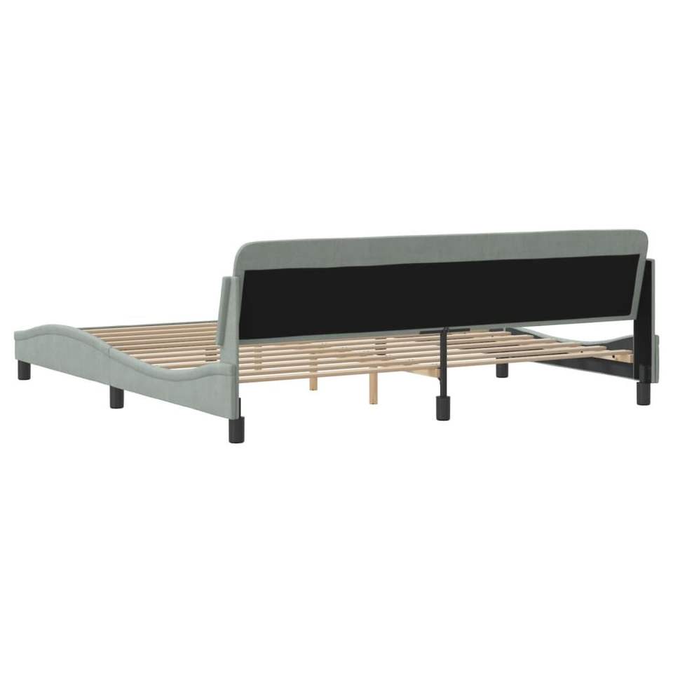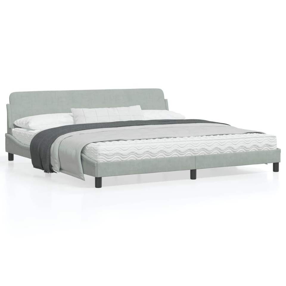 Cadre de lit rembourré gris clair, taille double, design minimaliste, revêtement en tissu, structure en bois, mobilier de chambre à coucher