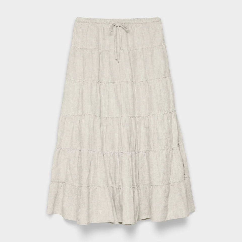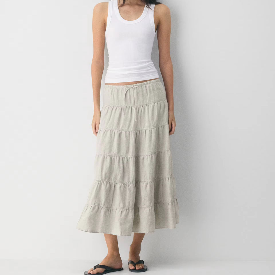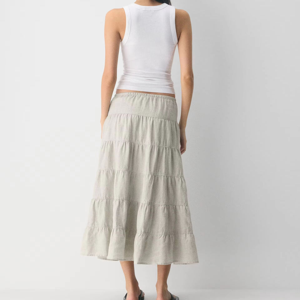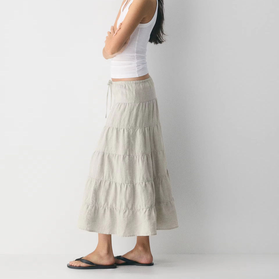 Jupe midi à volants en lin kaki clair avec cordon de serrage, style décontracté d'été