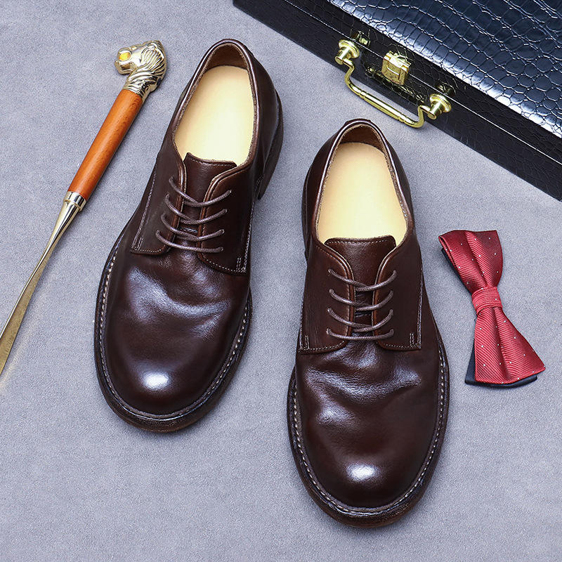 Light Luxury Men's Genuine Leather Oxfords Handcrafted Goodyear British Derby Stitching Large Soles Cowhide Shoes EVERGREEN