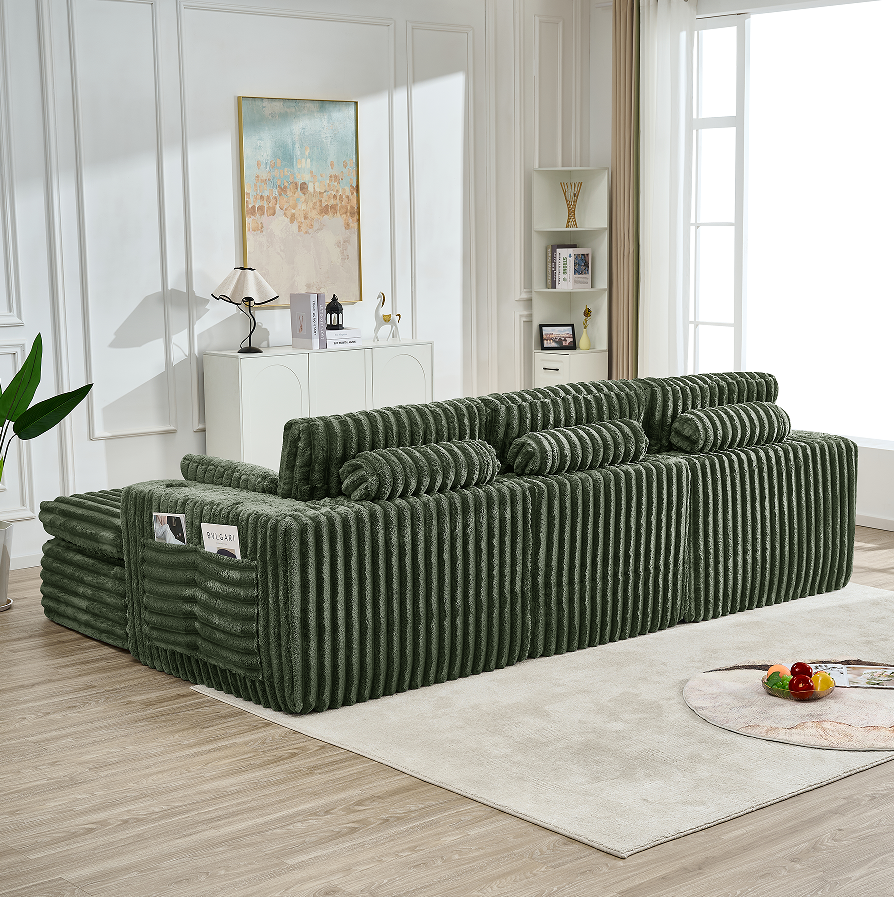 Canapé d'angle modulaire capitonné en flanelle côtelée, style luxe léger et moderne, avec ottoman - Vert, 3 places, écologique, pour salon