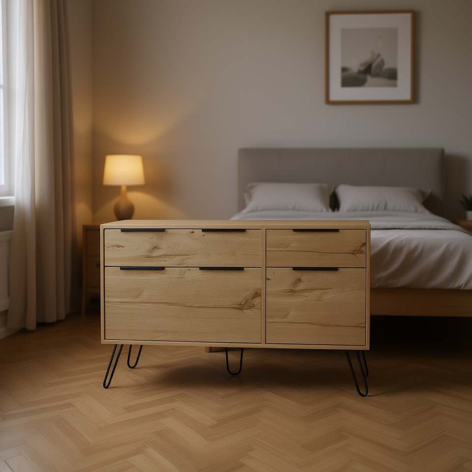 Commode à quatre tiroirs en chêne clair avec pieds en forme d'épingles à cheveux, meubles de chambre à coucher modernes