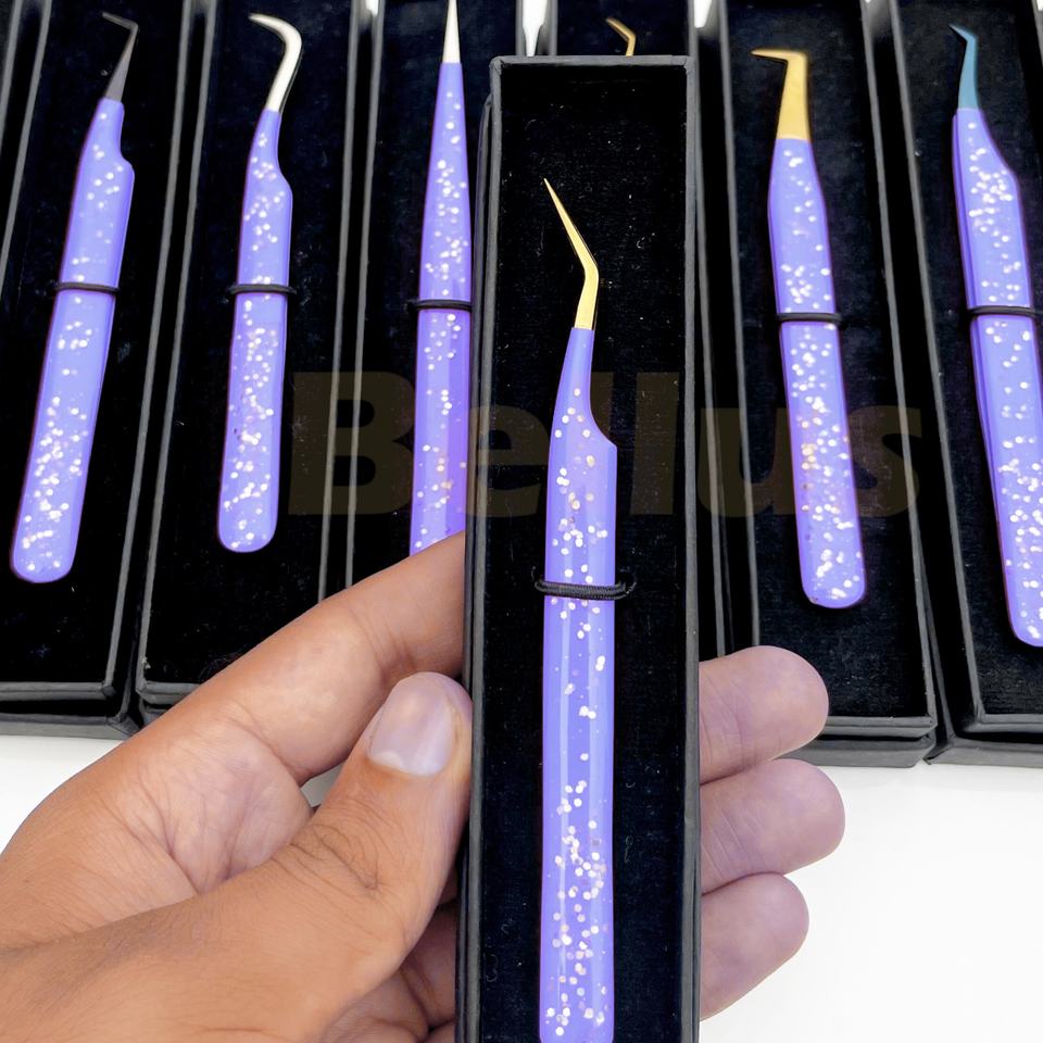 Pince à cils en acier inoxydable à revêtement pailleté violet clair, pointes pointues incurvées droites pour l'isolation du volume