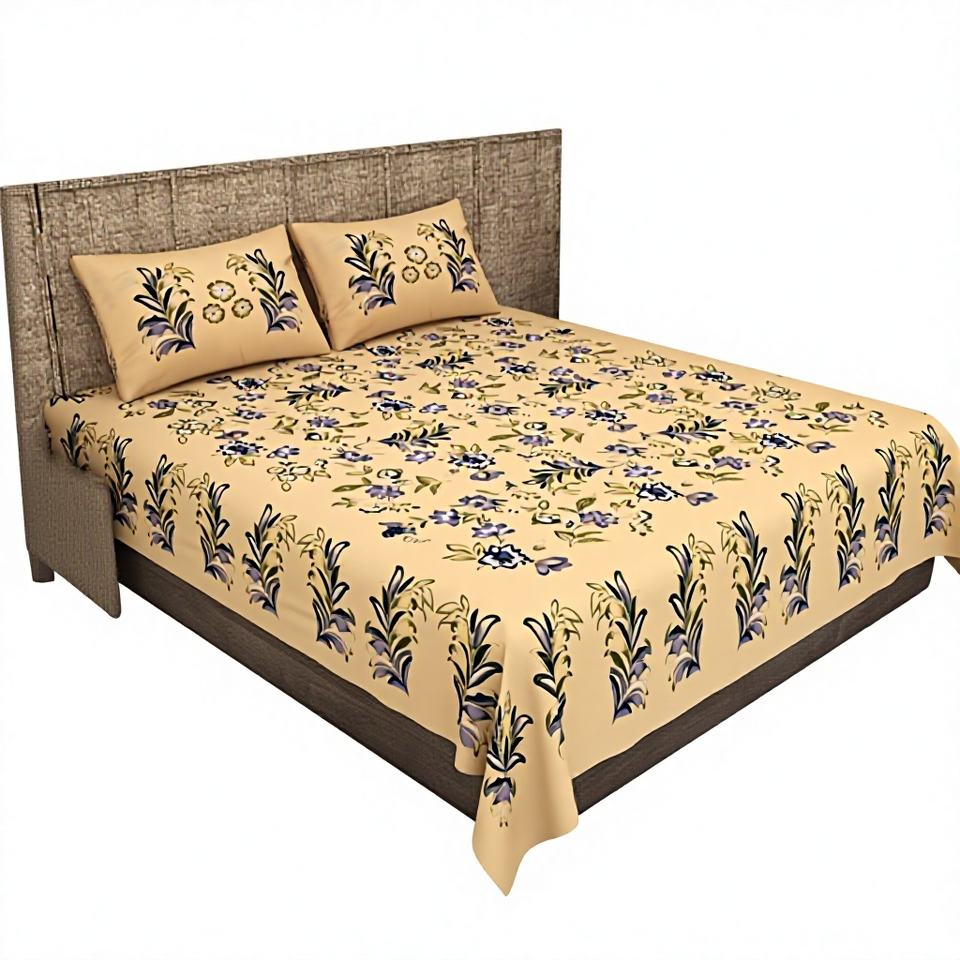 Parure de lit plate de mariage imprimée motif végétal jaune clair avec 2 taies d'oreiller, 100% coton 300 fils, écologique, toutes saisons, pour usage domestique