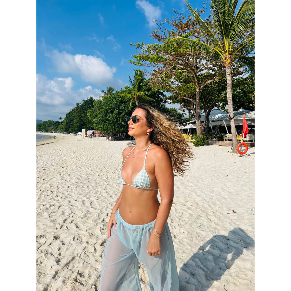 Pantalon évasé bleu clair taille basse élastique fait main