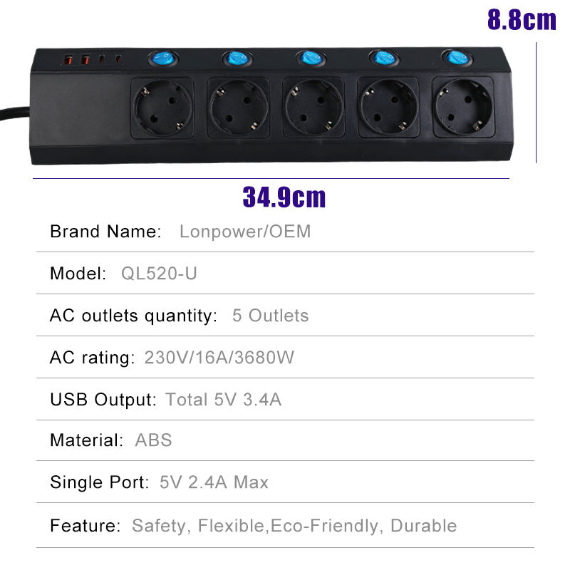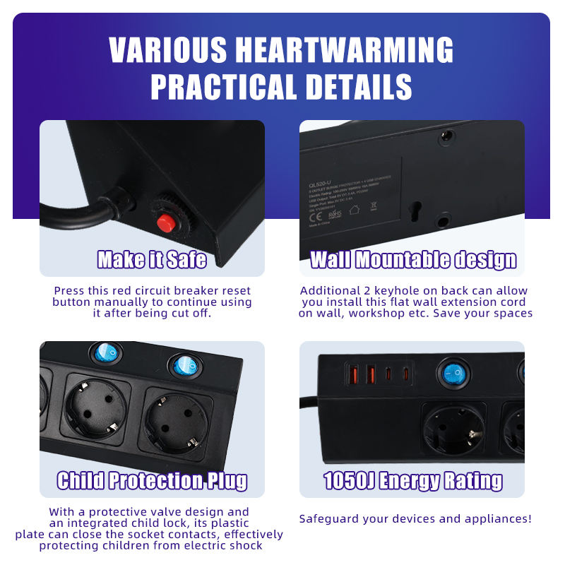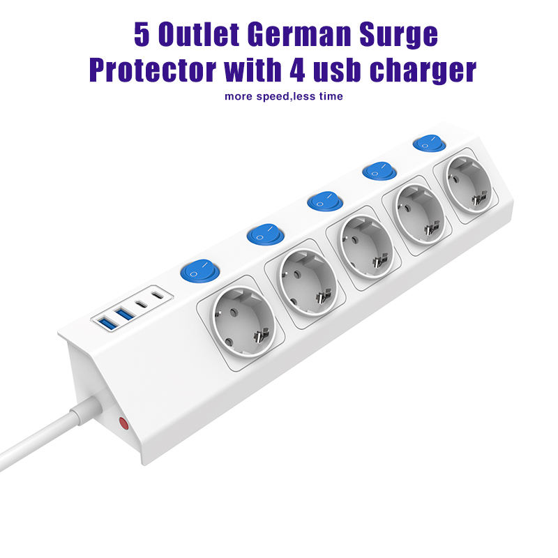 Multiprise industrielle avec protection contre la foudre, protection contre les surtensions MOV 16A, 5 prises, 4 ports USB, câble de 2 m