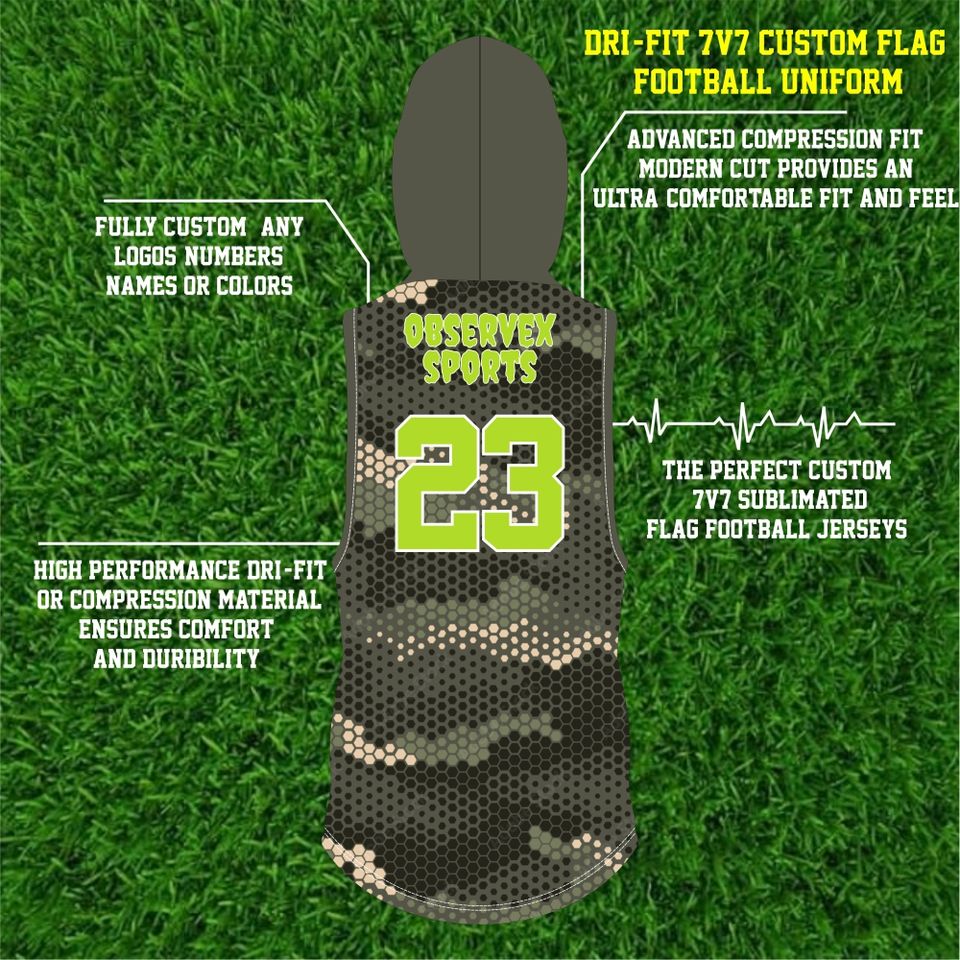 Ensemble de compression de flag football léger et respirant | Uniforme sublimé 7 contre 7 à capuche avec des caractéristiques d'évacuation de l'humidité et de séchage rapide