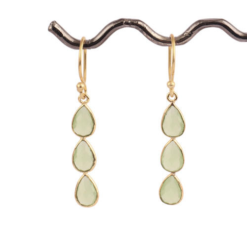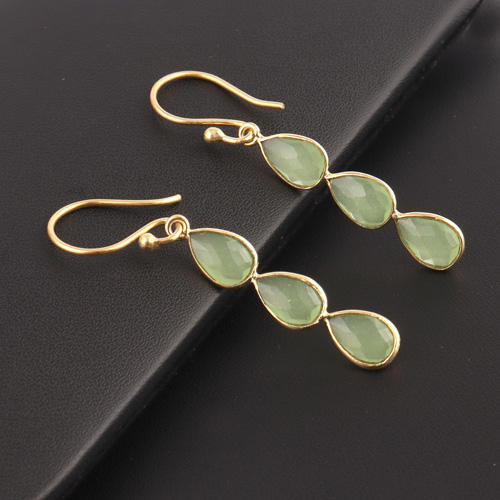 Boucles d'oreilles légères en laiton plaqué or Checker Cut Lite Green Calcedony Three Pear Gemstone Drop Punk Style pour mariage