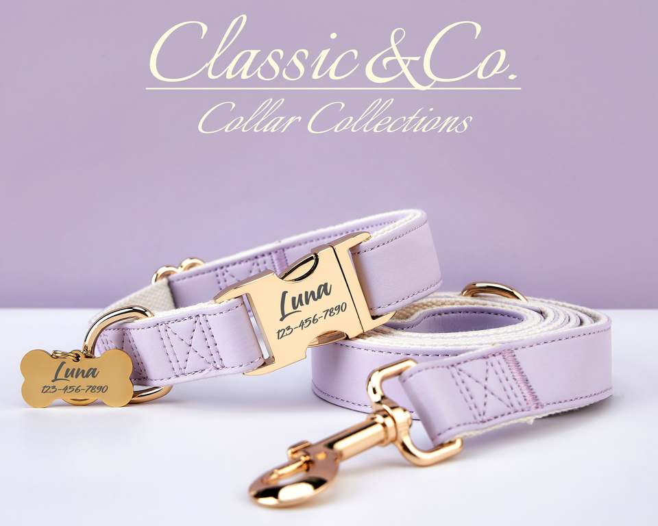 Cuir PU imperméable lilas et plomb, ensemble de laisse de collier violet pour chien solide, étiquette de nom de boucle en métal gravée gratuite, cadeau de chiot de mariage