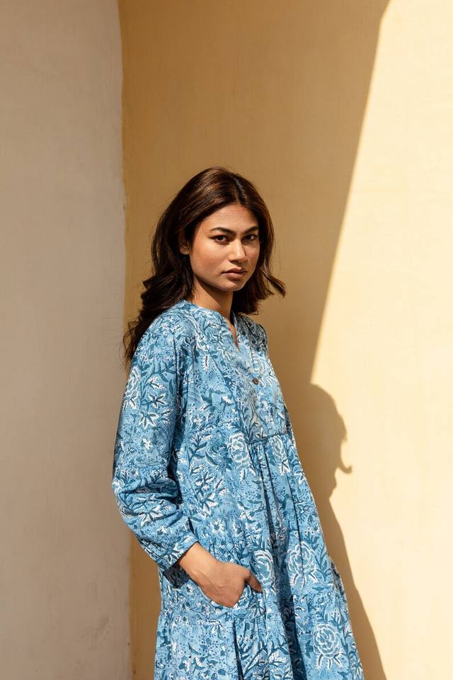 Lilamrita Floral Bohemian Dress Hand Block Printed Pure Cotton Blue White Casual Occasional Summer Wear