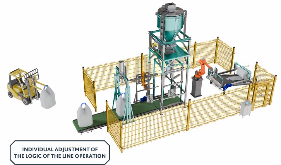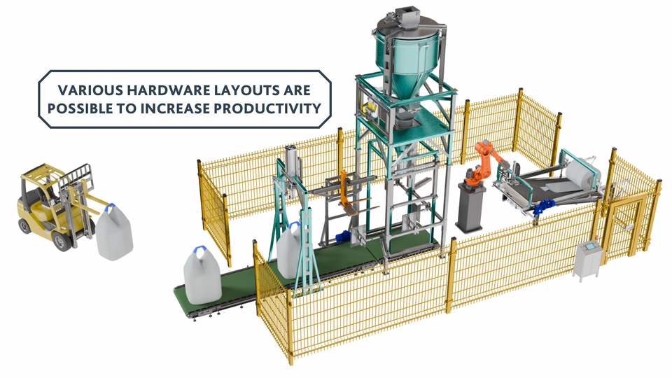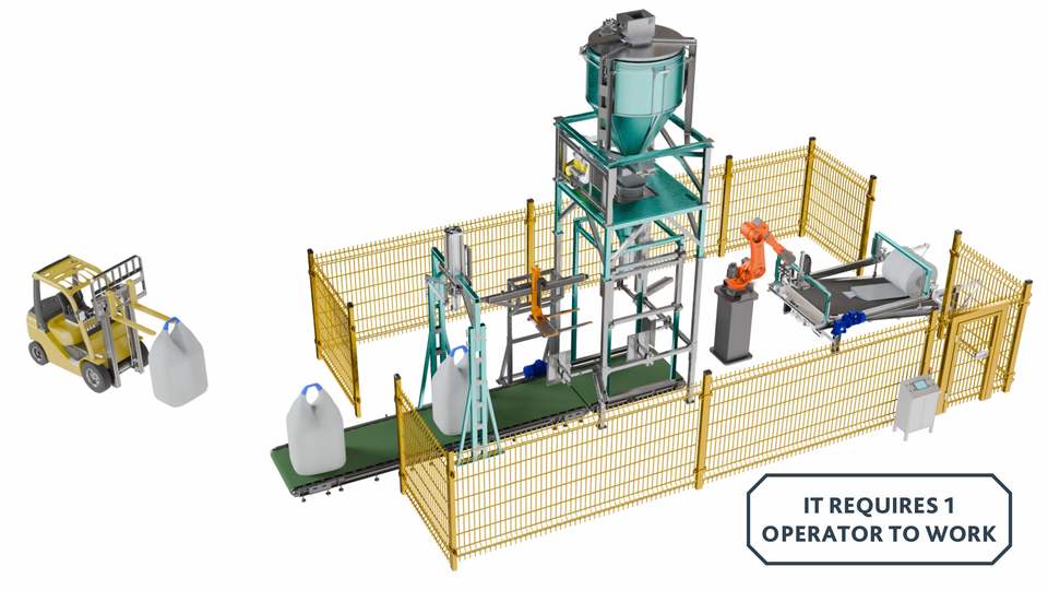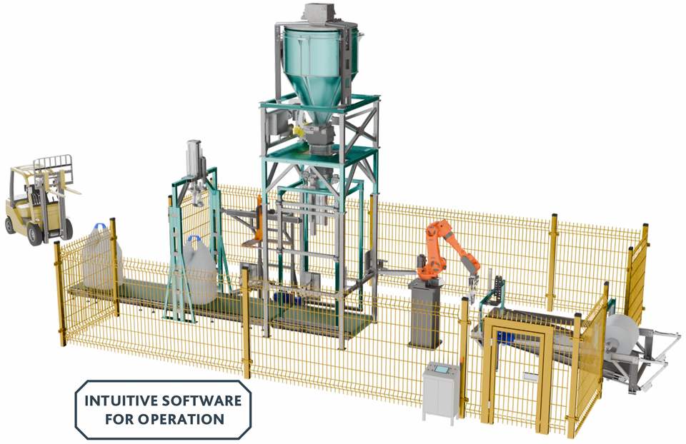 Complexe avec un bras robotisé pour le conditionnement en grands sacs