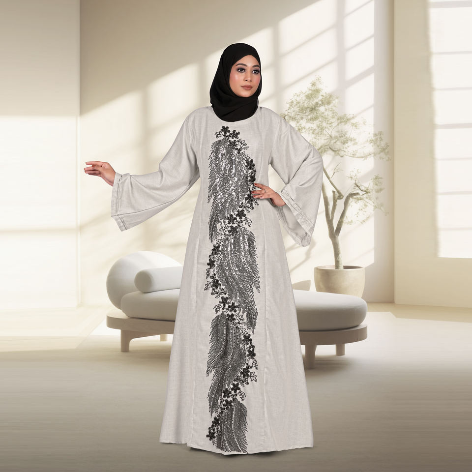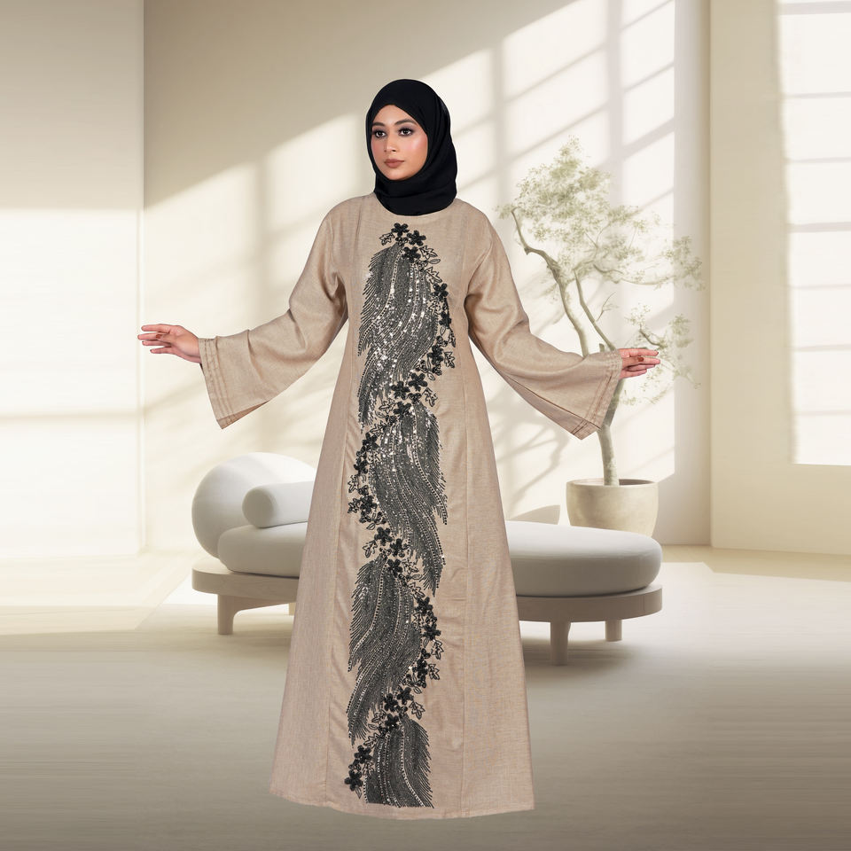 Abaya en lin avec panneau central brodé, coupe ample, manches longues, robe islamique contemporaine, tenue pour femmes du Moyen-Orient