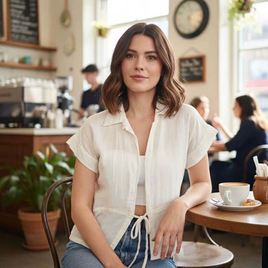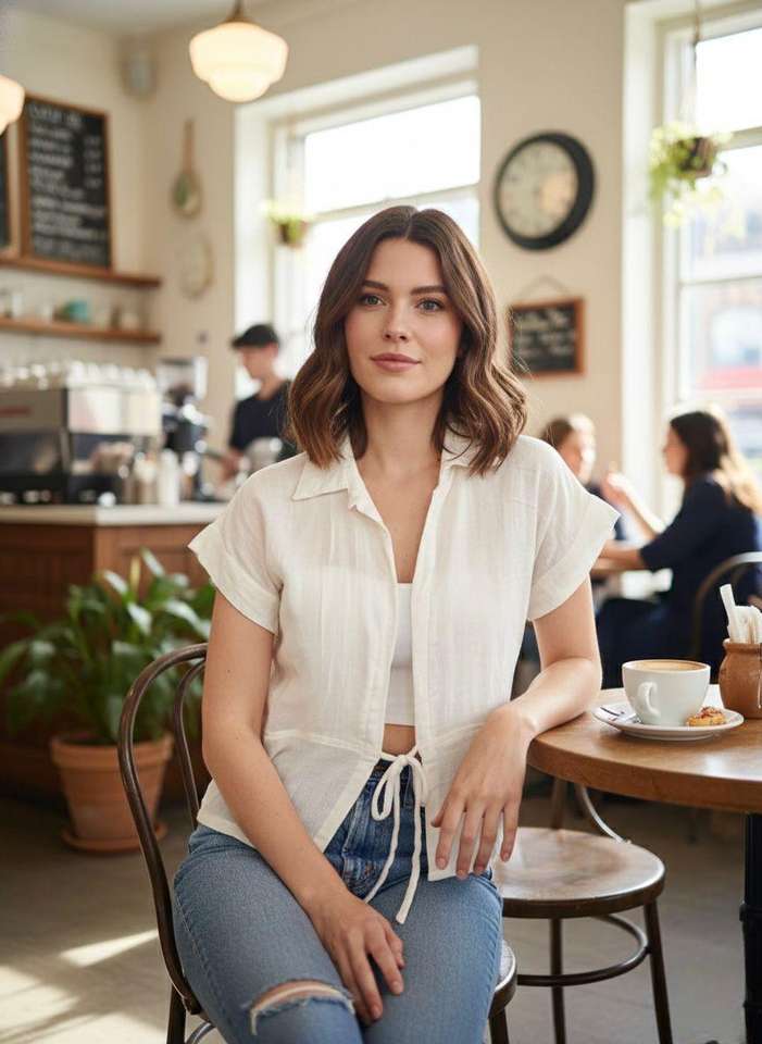 Chemise à manches courtes en mélange de lin avec nœud à nouer devant, tissu respirant de haute qualité, pièce essentielle polyvalente pour toute garde-robe contemporaine