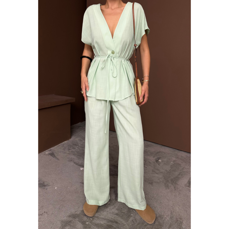 Ensemble chemisier et pantalon en lin à col en V et à taille nouée, ensemble de pantalon vert en deux pièces avec un design en deux pièces