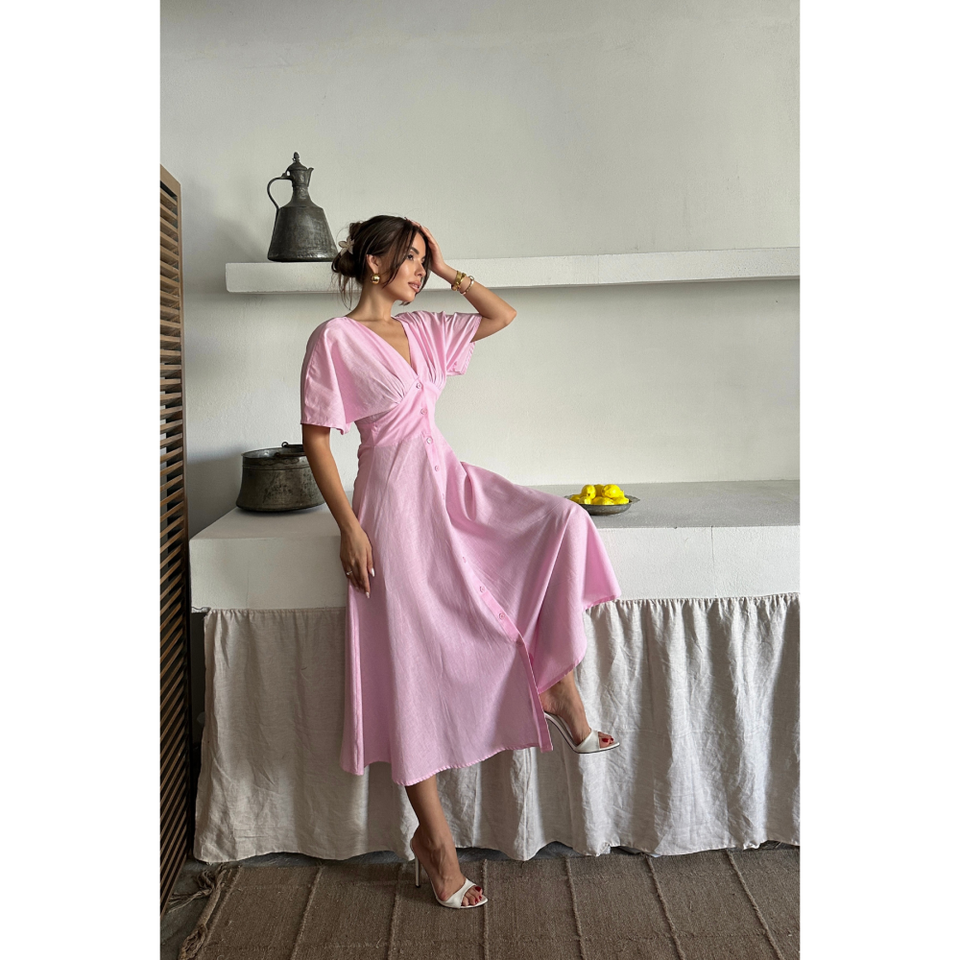 Robe en lin à col en V boutonnée sur le devant, rose, décontractée, longueur midi, taille S