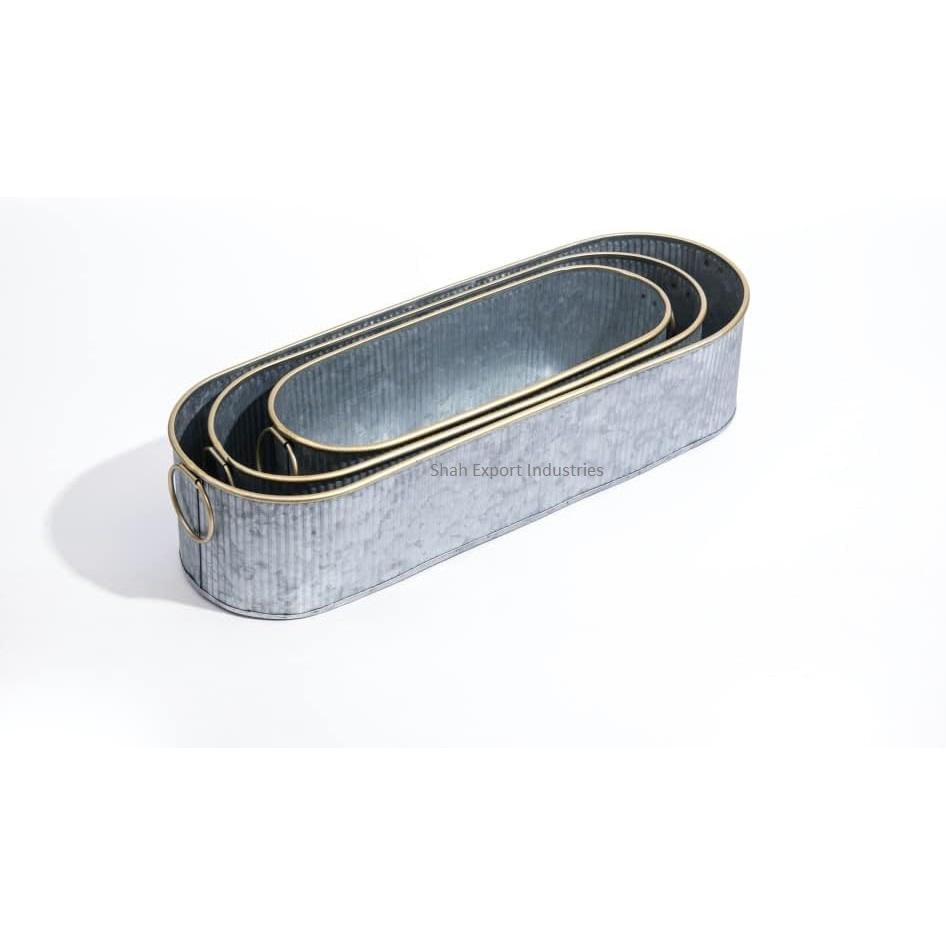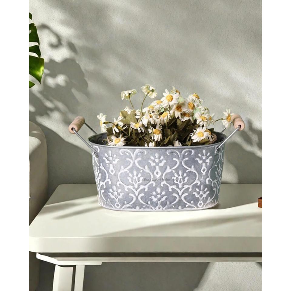 Jardinières de fleurs en métal galvanisé de conception de doublure avec poignées pour jardinières décoratives de forme ovale de jardin de salon à la maison