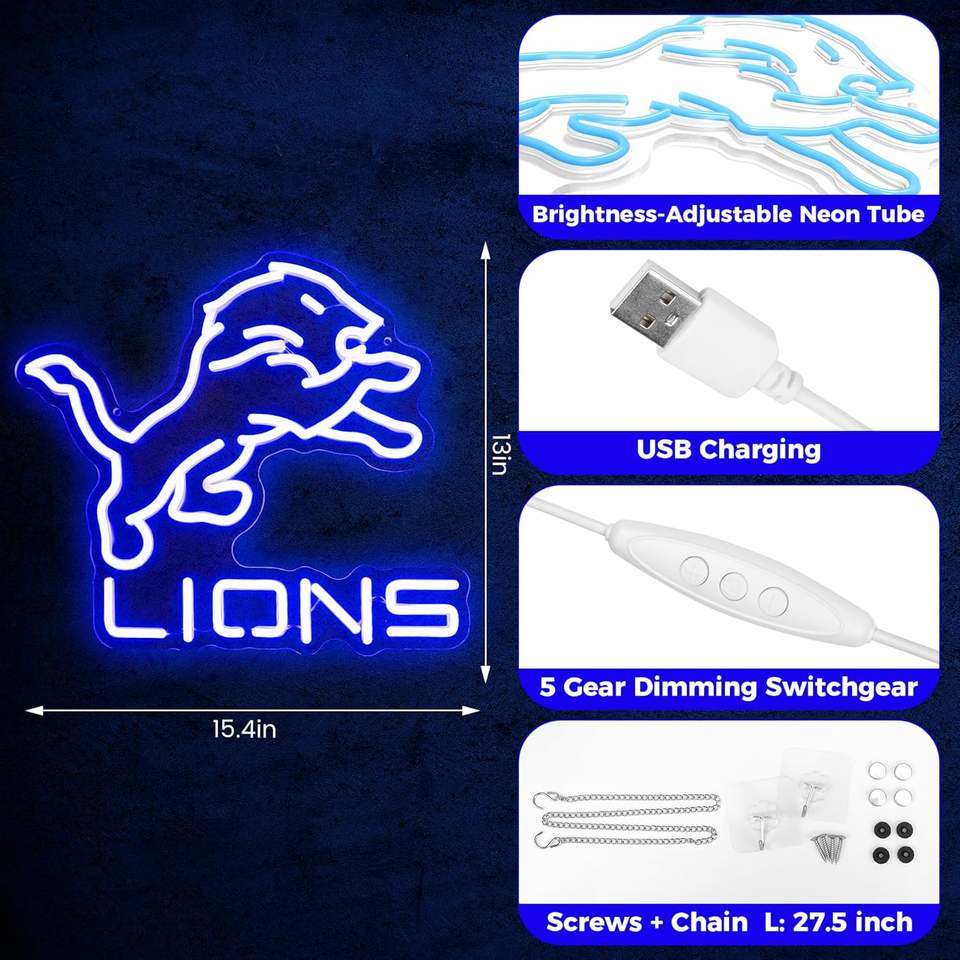 Enseigne néon multicolore de l'équipe de football des Lions, alimentée par USB, logo lumineux à intensité réglable pour la décoration murale de la maison ou du bar