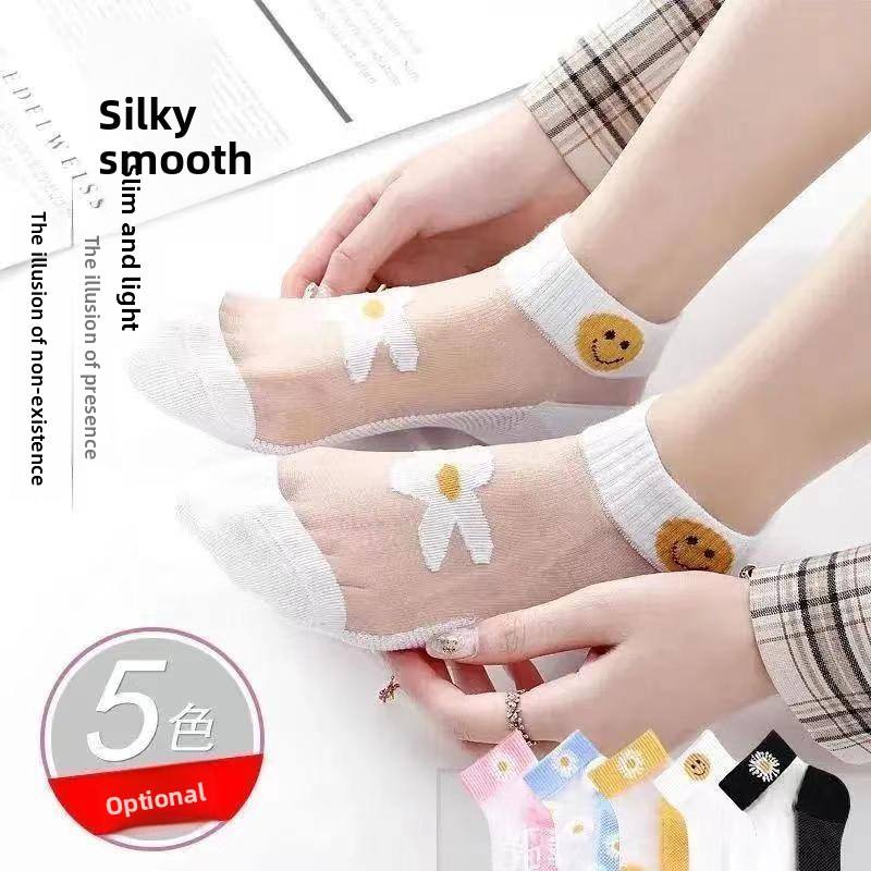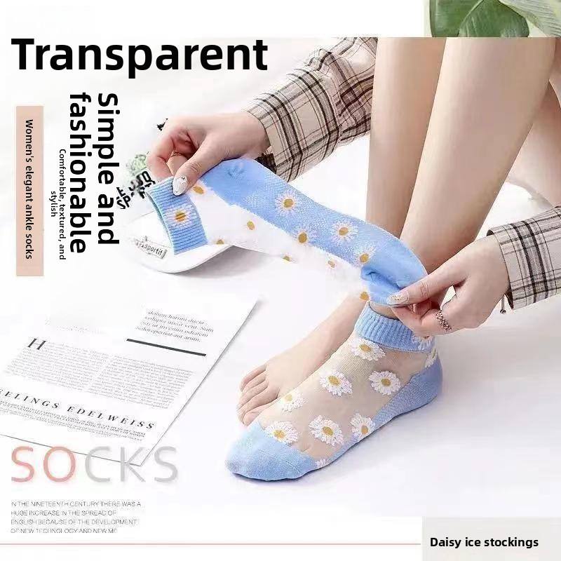 Chaussettes courtes en polyester tricoté Little Daisy Ice pour femme, antidérapantes, fines, à motif floral, style célébrité internet, effet verre cristallin
