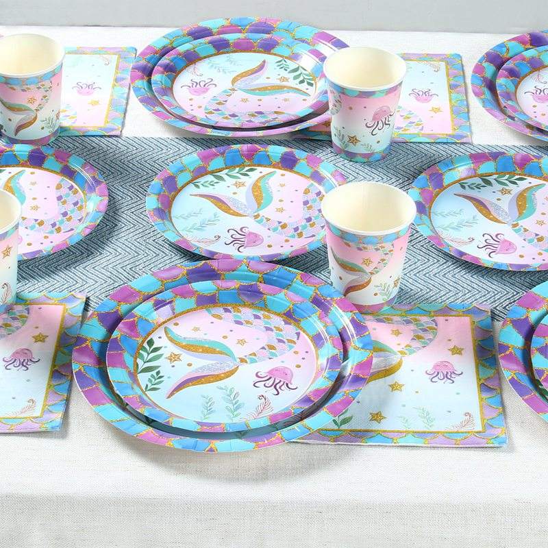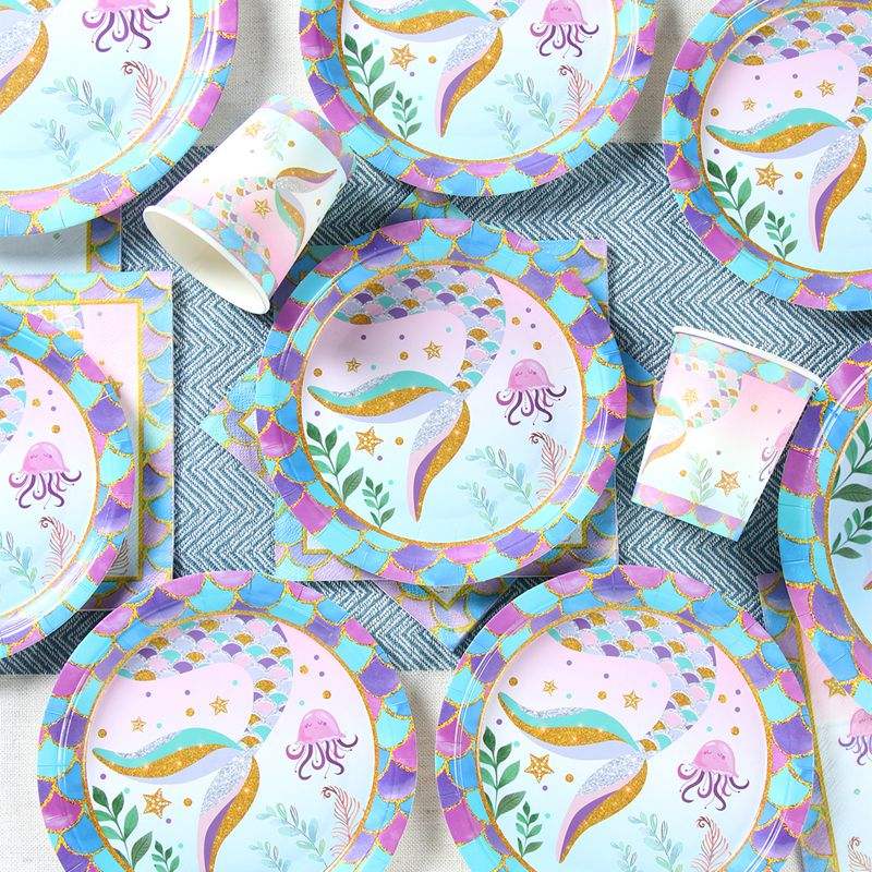 Décorations de fête d'anniversaire de la petite sirène, vaisselle jetable, fête prénatale, 1er anniversaire, fête de la petite fille sirène, assiettes en papier